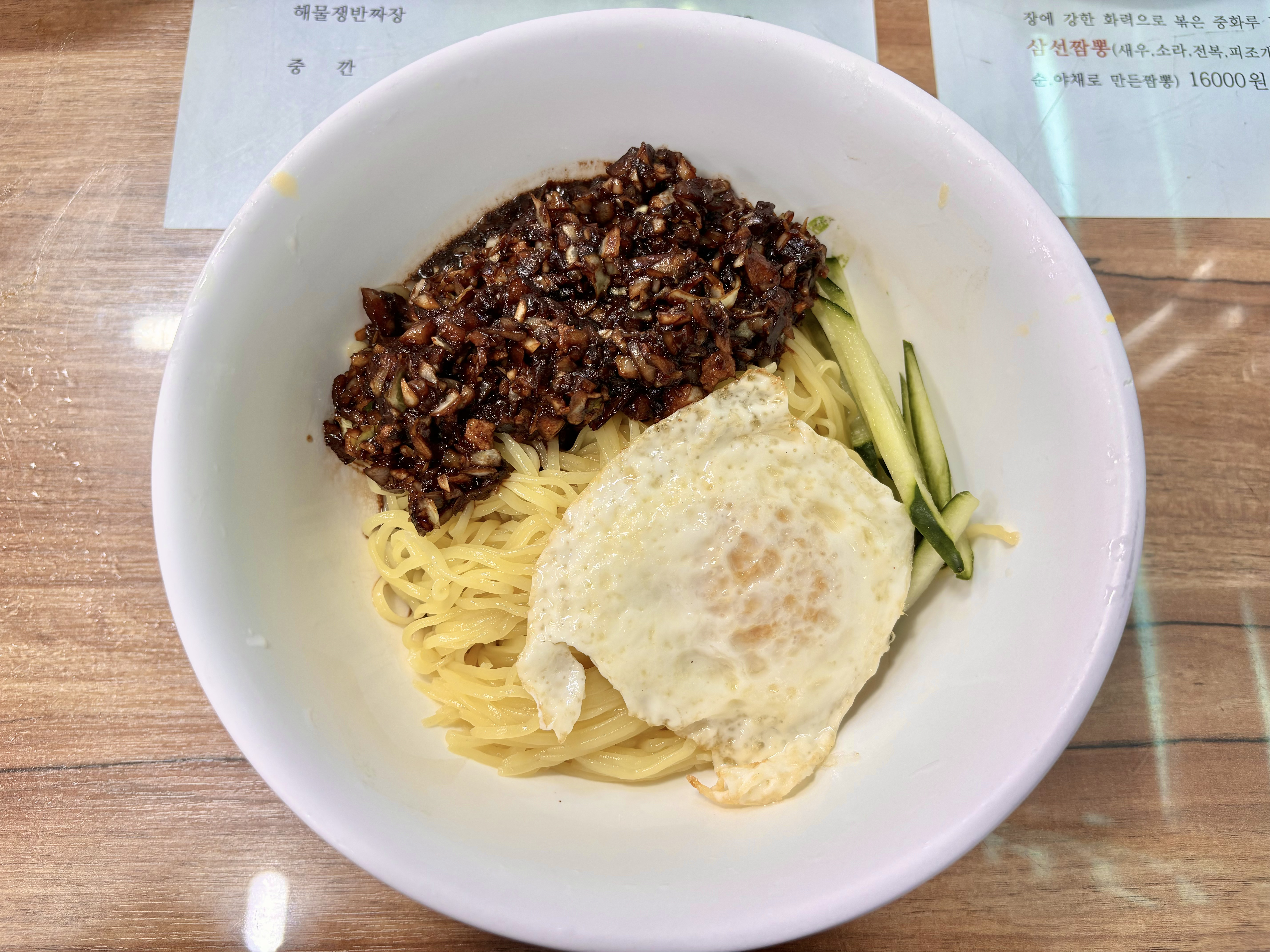 코스 요리의 마지막인 후식 짜장면이 기원이 되어 현재의 메뉴로 자리 잡게 되었다는 중깐. 면을 얄쌍하게 뽑아 되직하게 다져진 짜장 소스와 비벼 먹는 부담 없는 짜장면입니다.