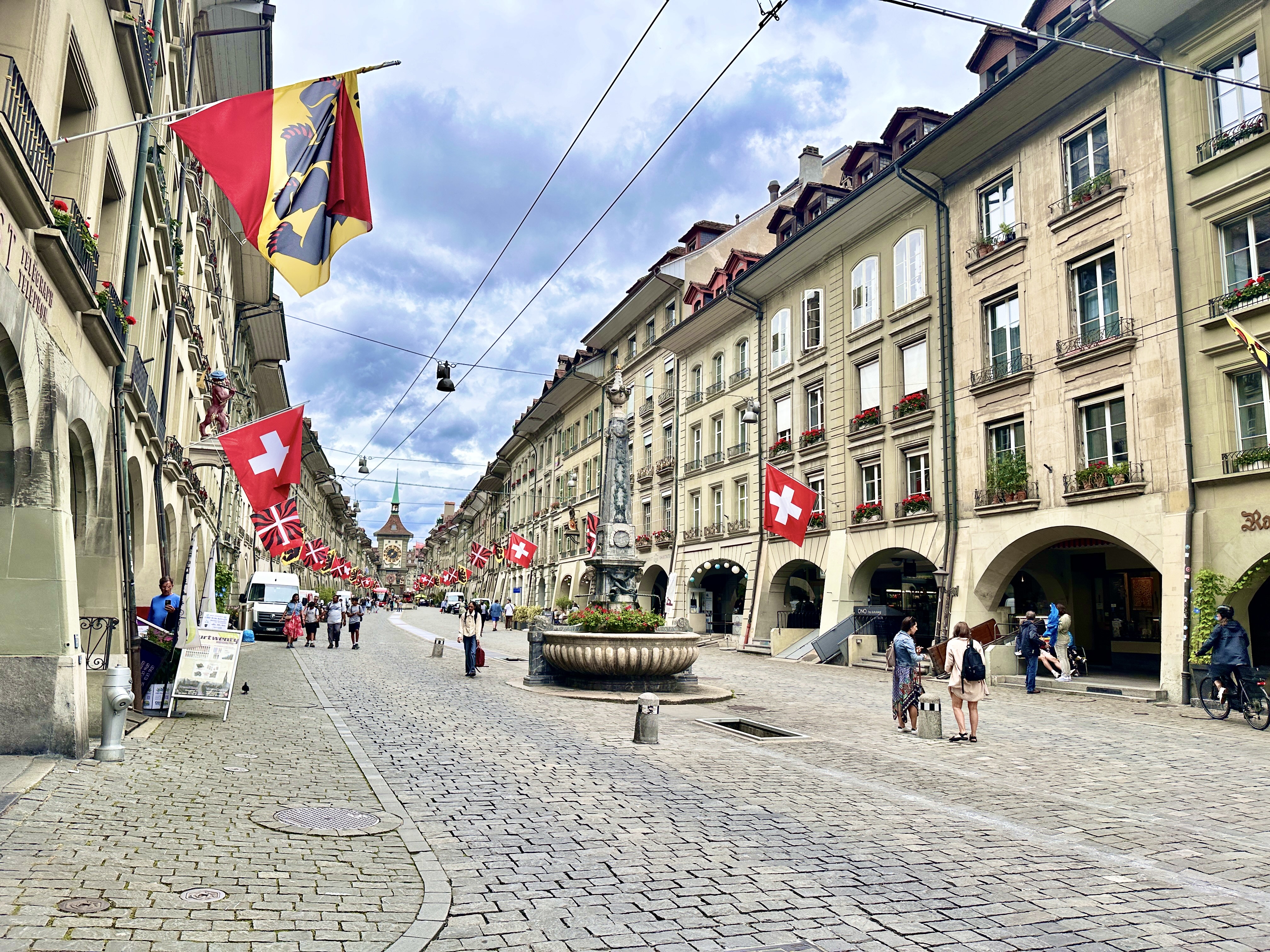 익히 듣긴 했으나 정말로 아름답고도 아름다운 도시가 베른이었다. 베른역에서 내리고 구시가지를 걷는 순간의 누구나가 그리 느꼈으리라. 거리를 누비는 빨간 트램도, 스위스의 국기들도 기억에 남아있고, 촘촘히 길을 내어주는 것도 같은 아케이드 구조의 건물. 강렬하다.