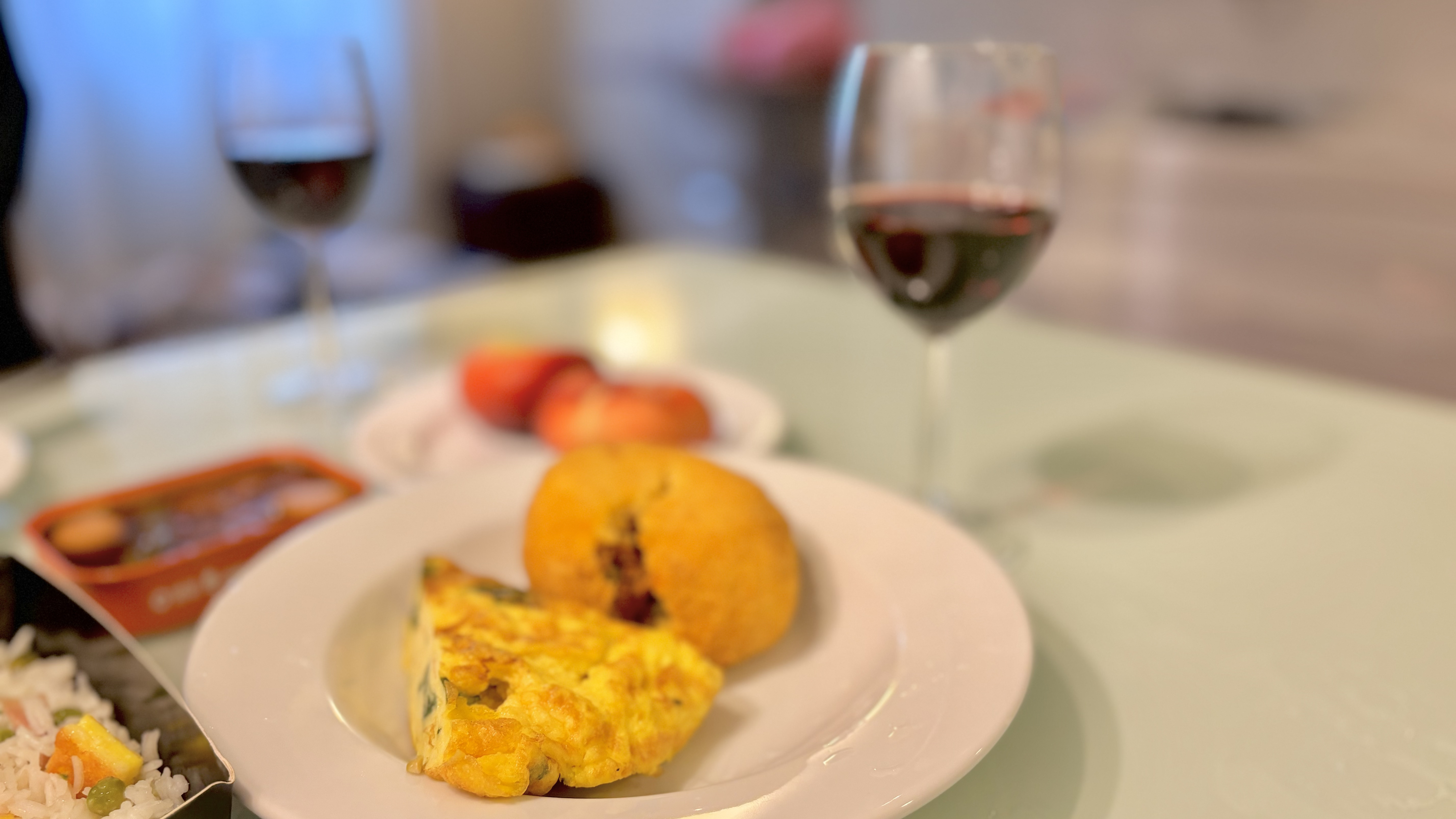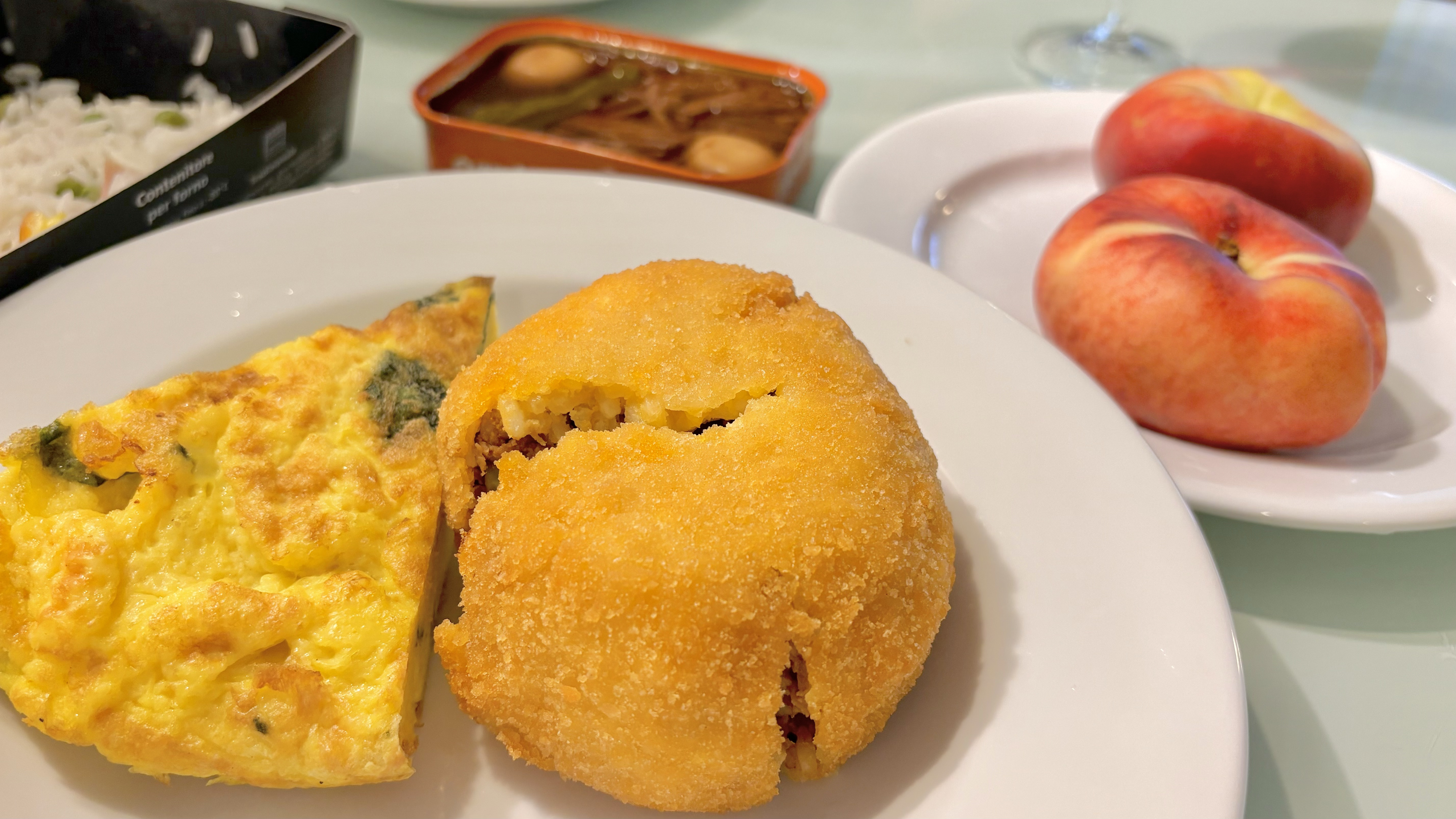 아란치니, 내내 자주 즐겼던 납작복숭아와 함께 와인 한 잔.