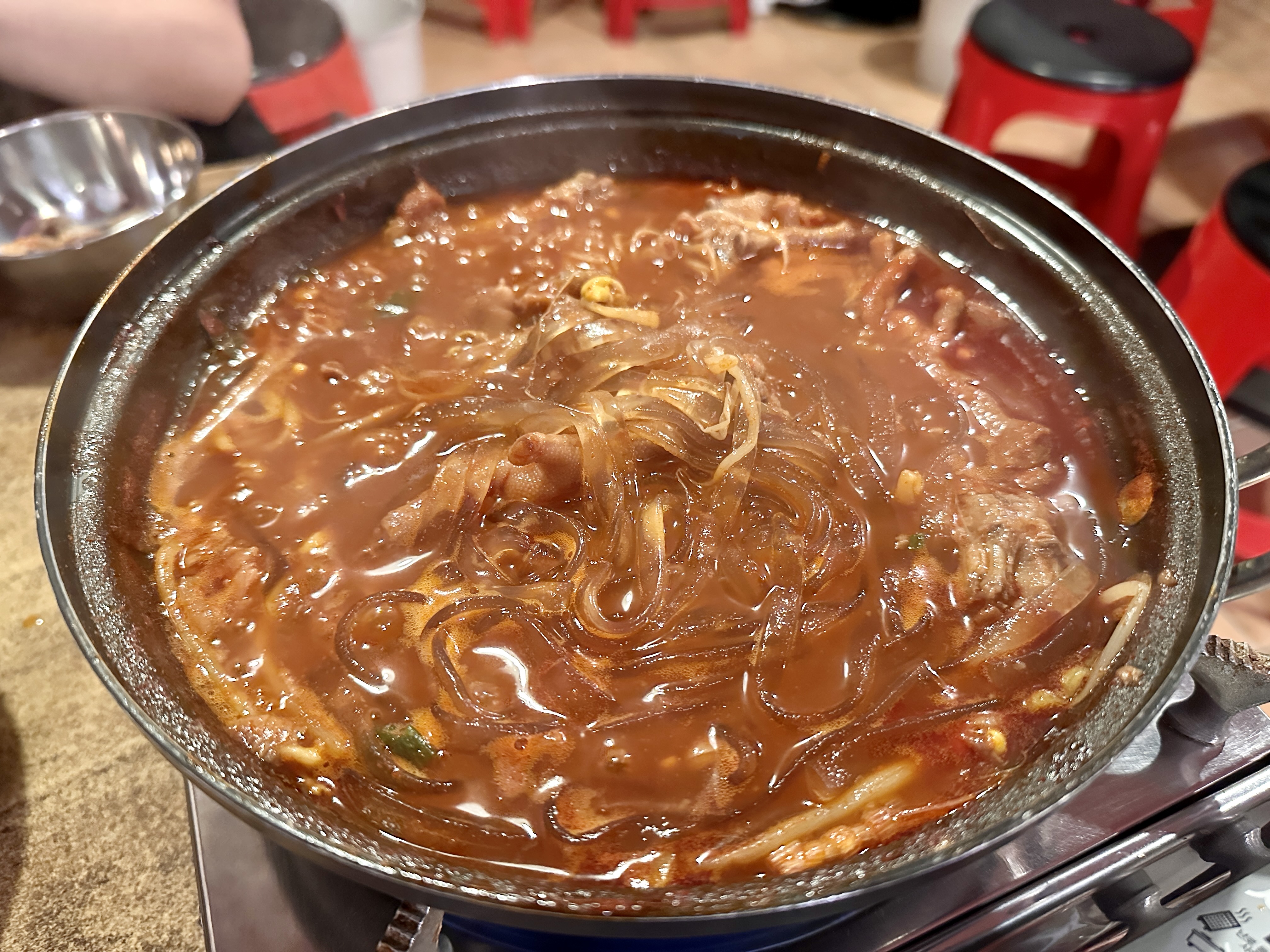 어느 정도 닭발들을 클리어한 뒤에 그래도 국물이 좀 여유가 되는 타이밍에 당면 사리를 추가합니다. 빠지면 섭섭하죠. 당면에 국물이 그대로 스미게 되는데, 매운맛을 온전히 흡수하고 느끼기 위한 방법이기도 합니다.