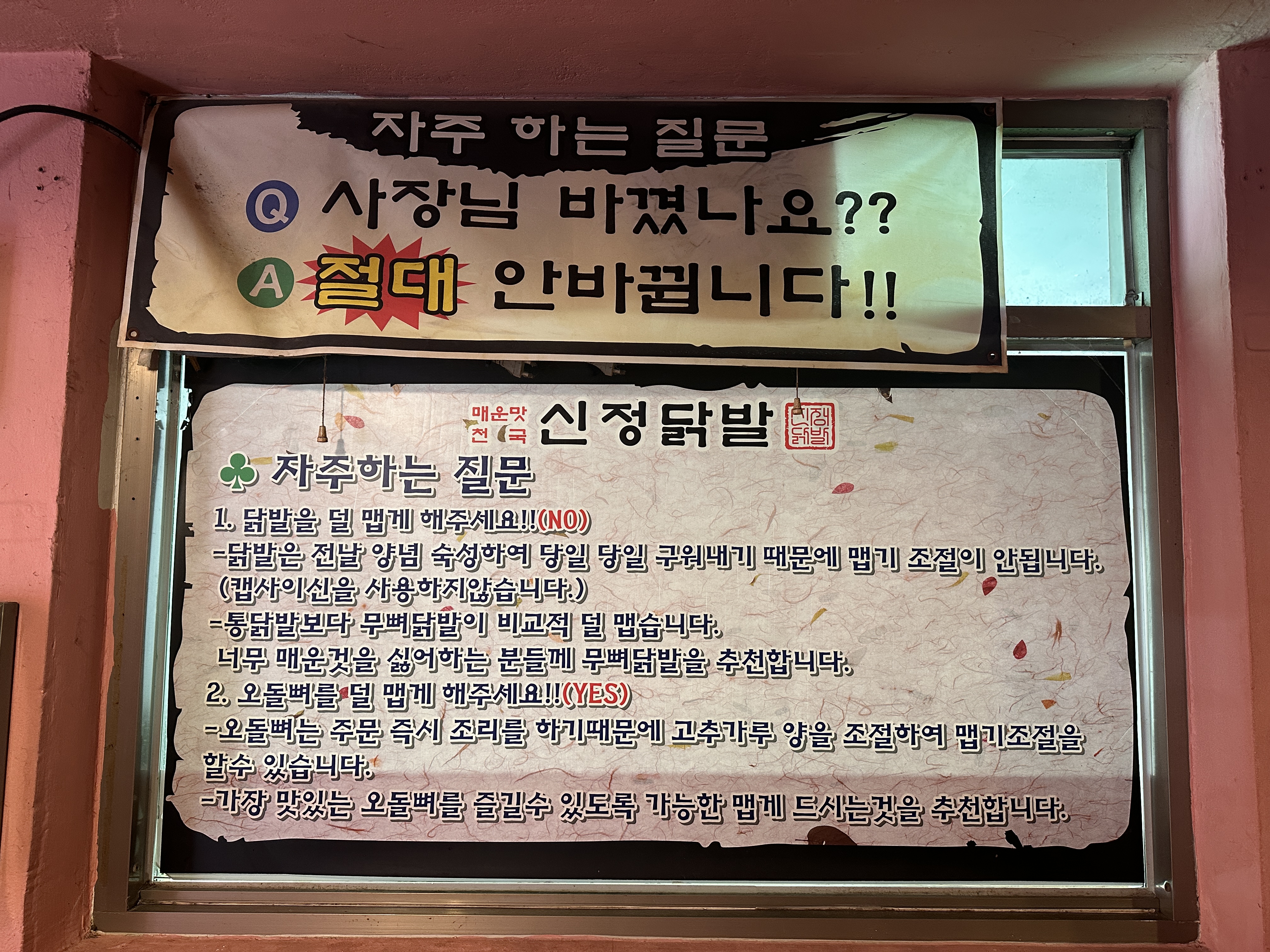 점심 고민으로 시작해서 아주 긴 시간을 심사숙고한 끝에 오늘은 신정닭발로 가자 어렵게 결론이 나게 되었습니다. 장장 2시간에 걸친 고민이었을 겁니다. 때문에 이미 점심은 지날 대로 지난 상태였고, 방문하자 오픈 시간인 16시 언저리가 되었네요. 때아닌 오픈런이었습니다.