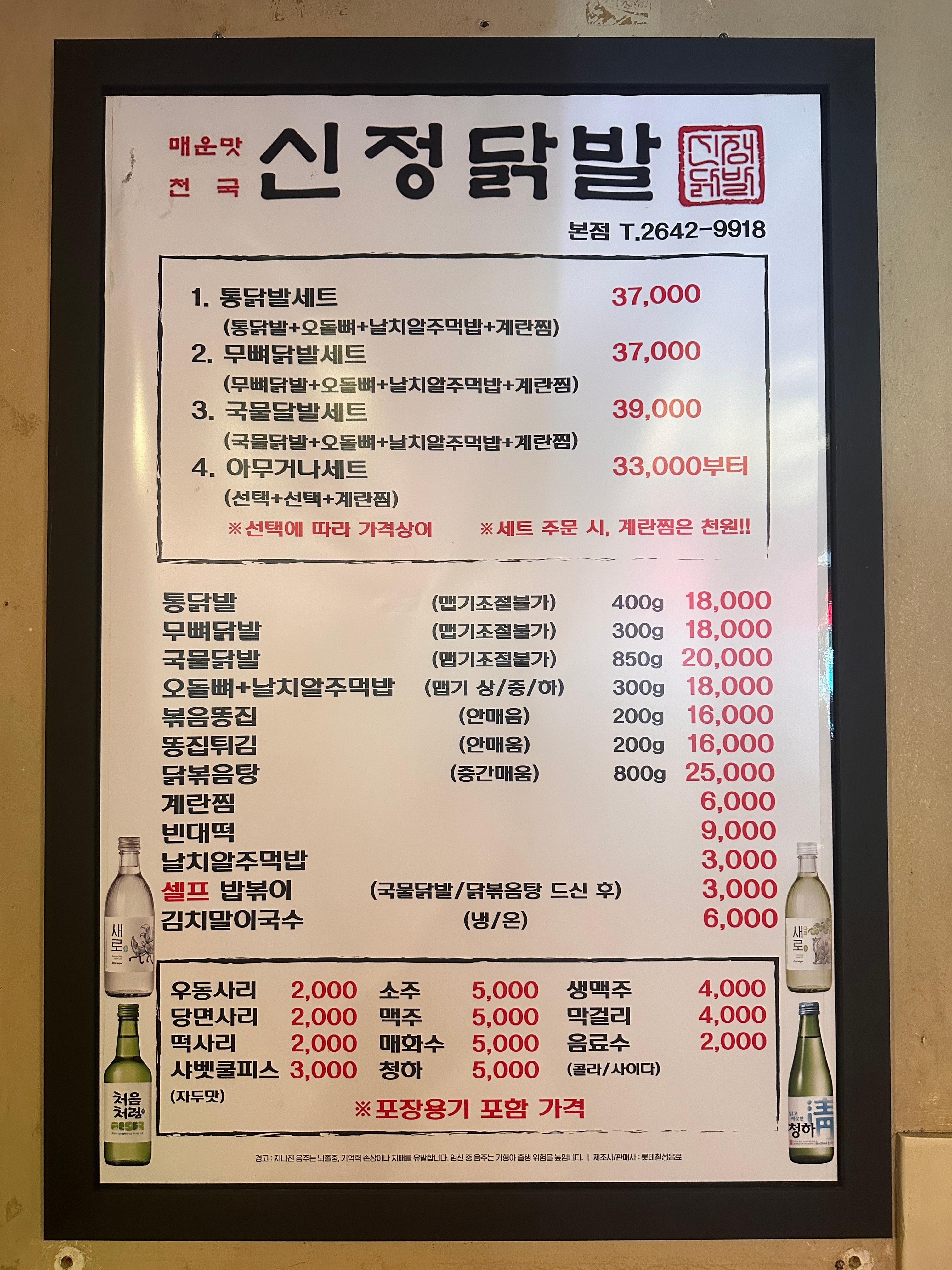 메뉴판입니다. 매운맛 천국이라니 참 좋네요. 본점은 처음이니 당연히 이곳의 시그니처로 갑니다. 국물닭발로 가주었고, 거기에 주먹밥과 계란찜을 주문했습니다. 정말 맵다는 통닭발은 이렇게 또 후순위로 밀려나게 되었네요. 평양냉면도 그렇고, 늘 즐겨 찾는 음식이 있는 집에선 매번 이렇지요. 다음 방문에도 통닭발은 또 다음을 기약할 가능성이 높습니다.