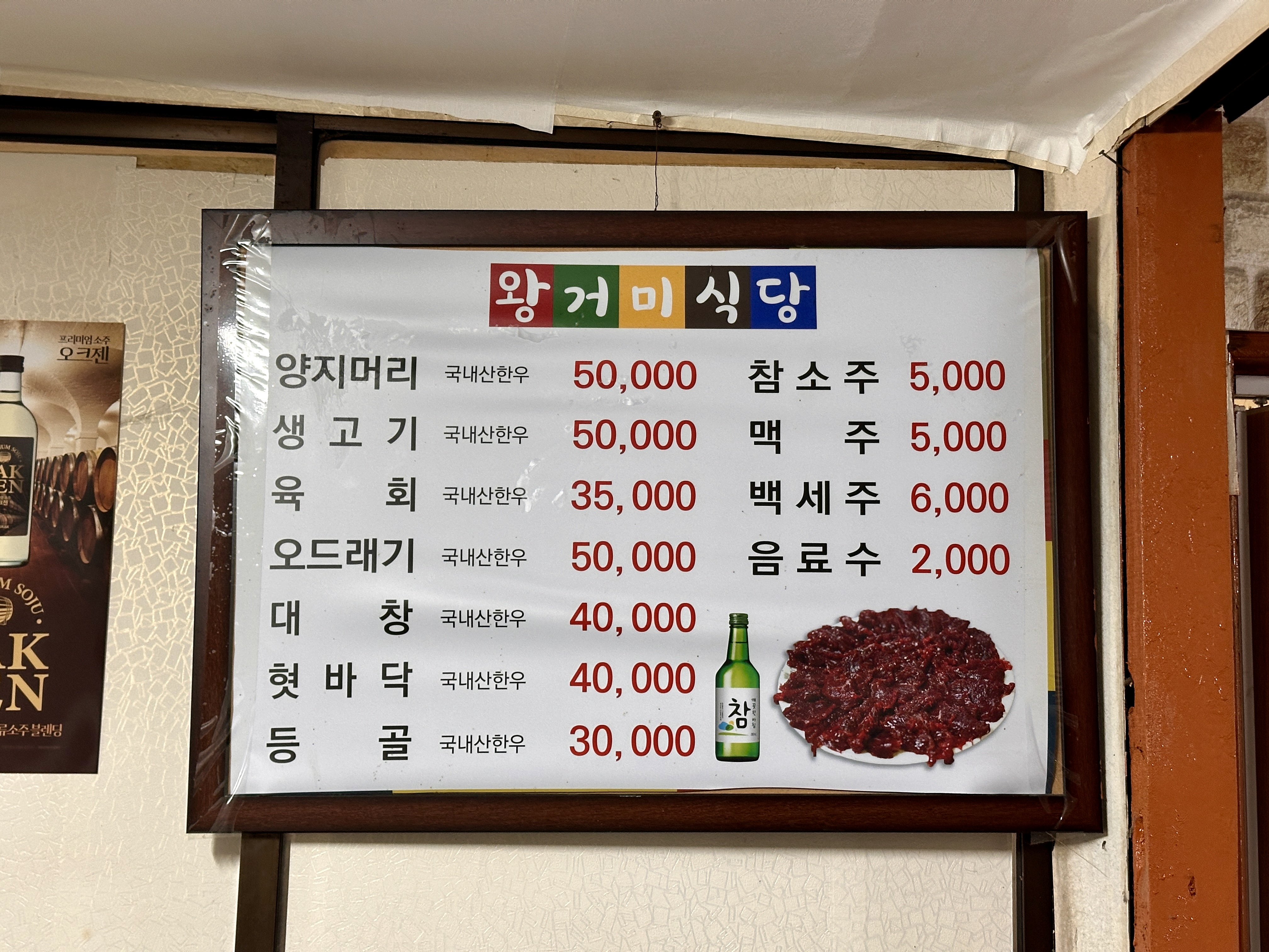 이제 착석 후 메뉴판으로 넘어가 보겠습니다. 만만치 않은 가격들이죠. 그래도 메인은 저 생고기인 뭉티기인데, 오드래기라는 녀석을 추가로 가야 하나 말아야 하나, 꽤나 심도 있게 고민했네요. 두 가지를 시키면 10만 원은 훌쩍 넘게 되니 말입니다.