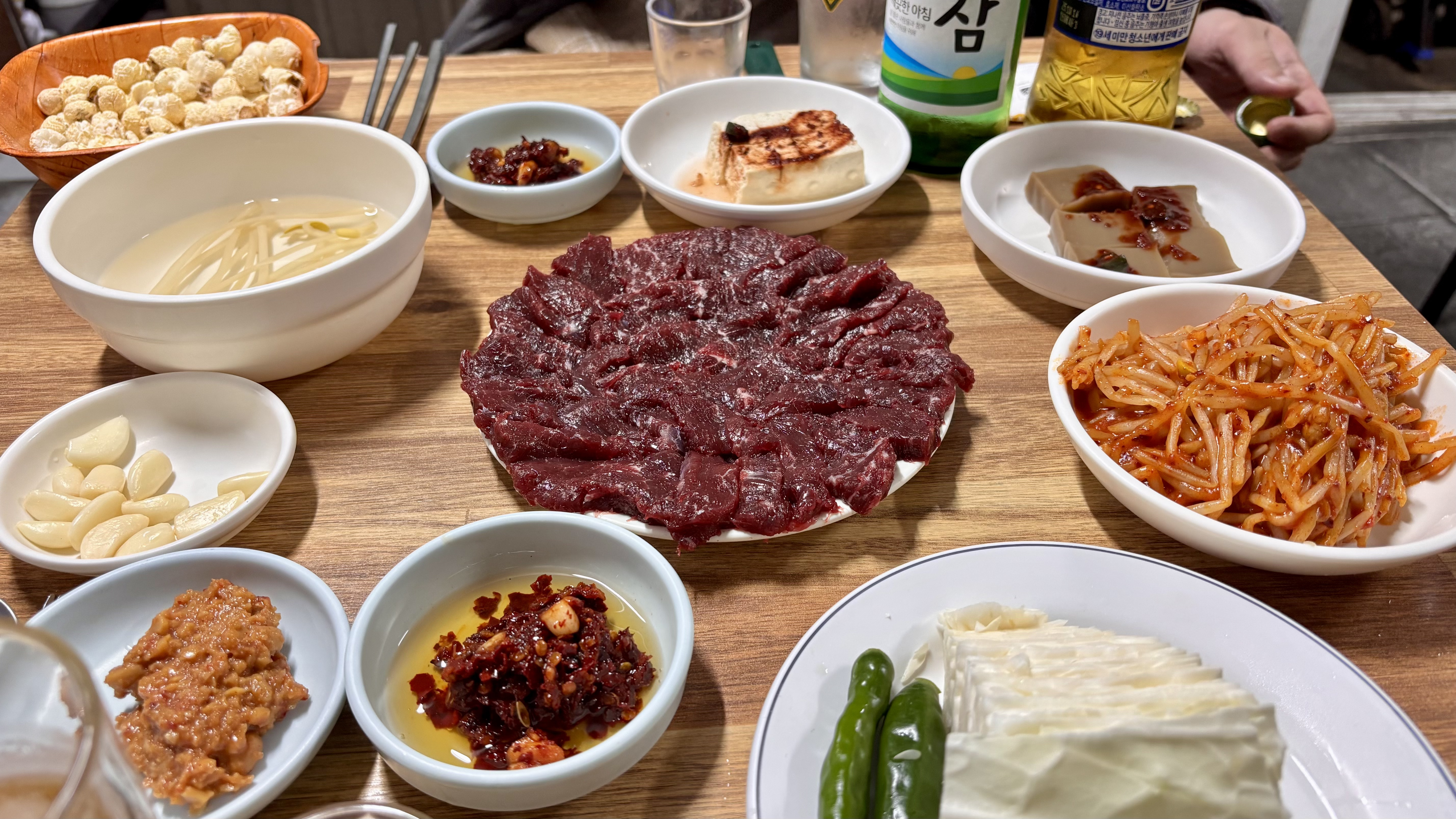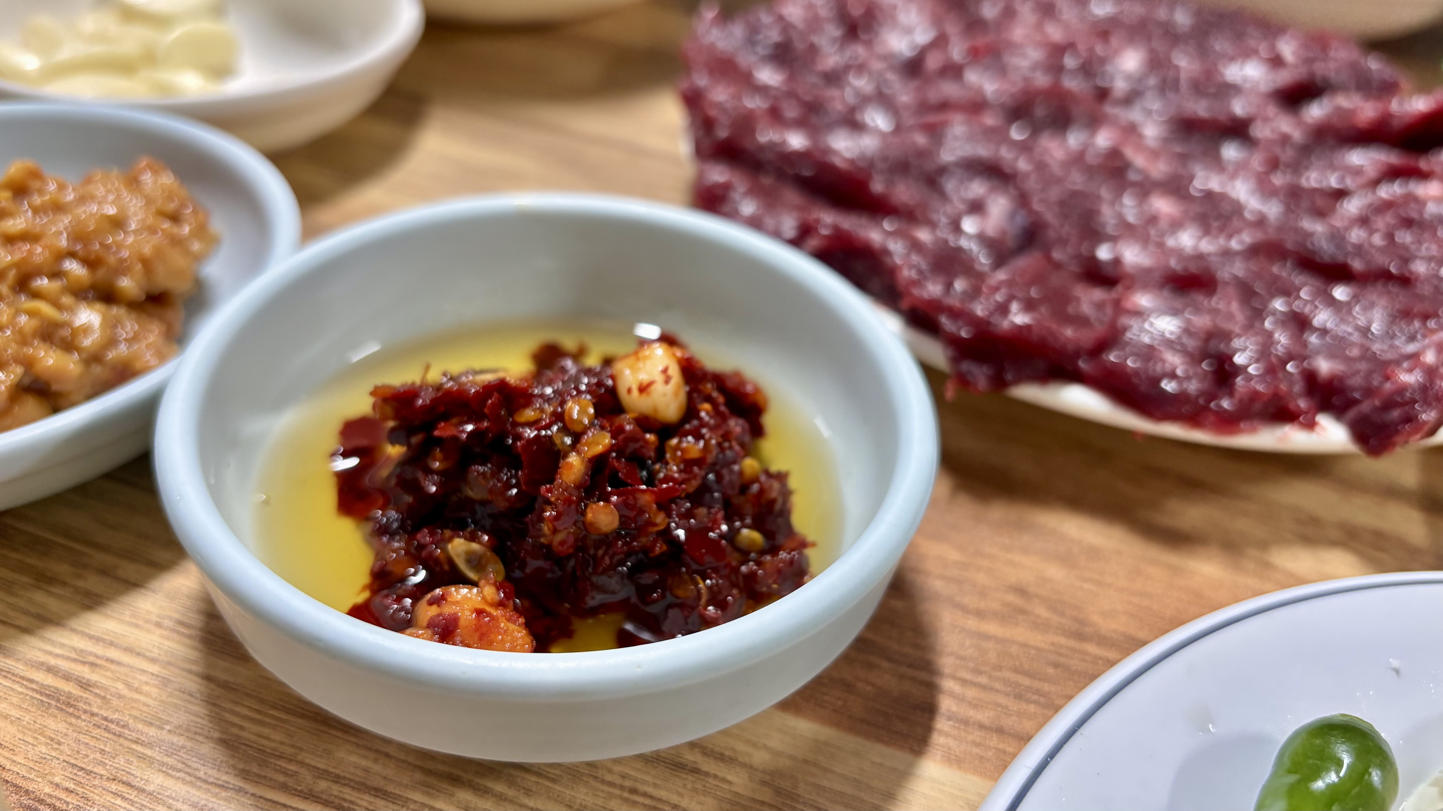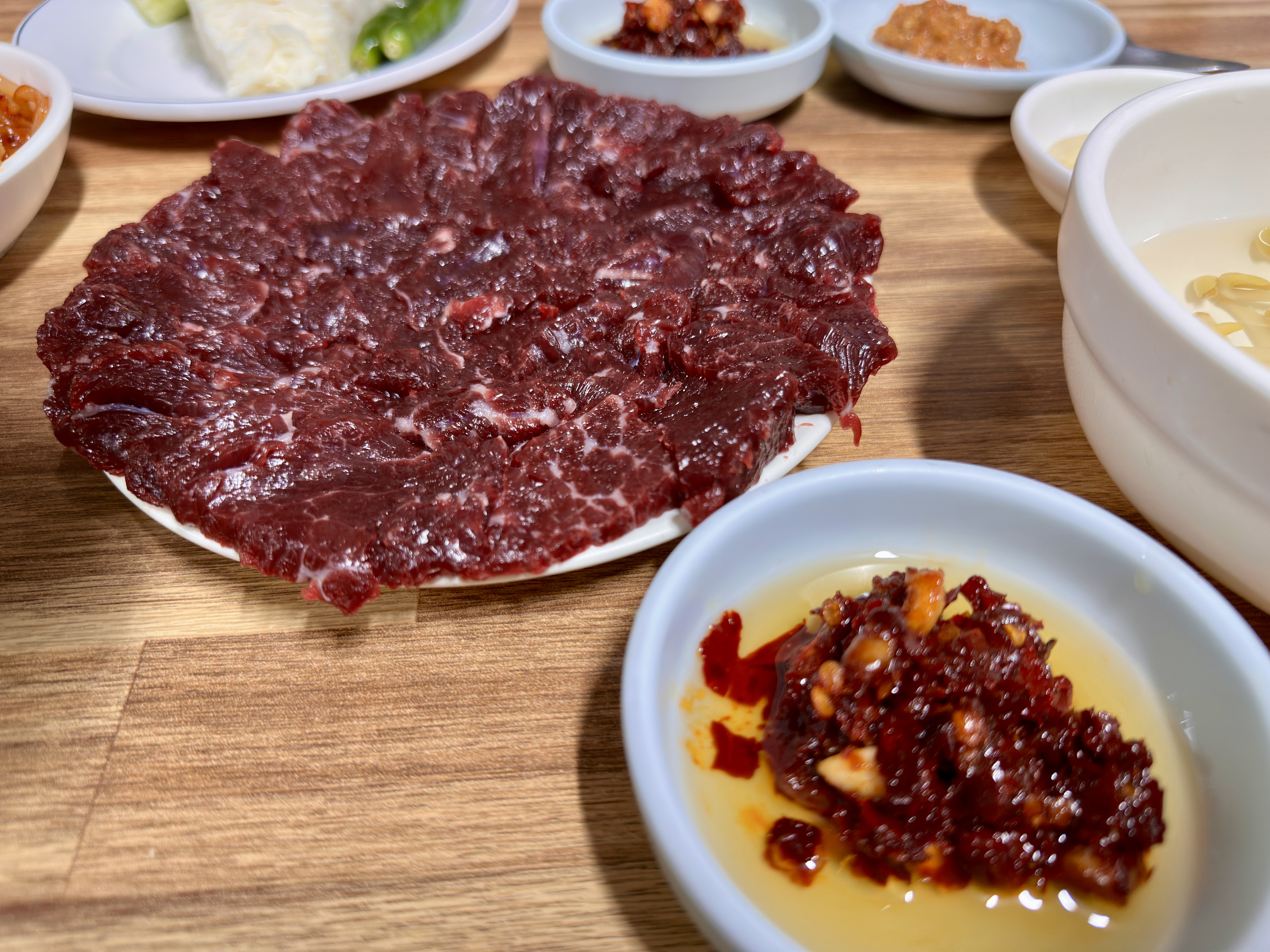 이 전용 고추기름장에 쿡 찍고 아쉽지 않을 정도로 둘러야 간이 좀 밸 정도로 슴슴했던 뭉티기였습니다. 굉장히 목적성과 목적의식이 강한 생고기였다고 하겠습니다. 인위적으로 창조한 젤리 식감의 고기랄까요? 생고기임에도 근막 힘줄 등을 제거해 고기 본연을 느끼기 위해 창조된 고기라 하겠습니다.
