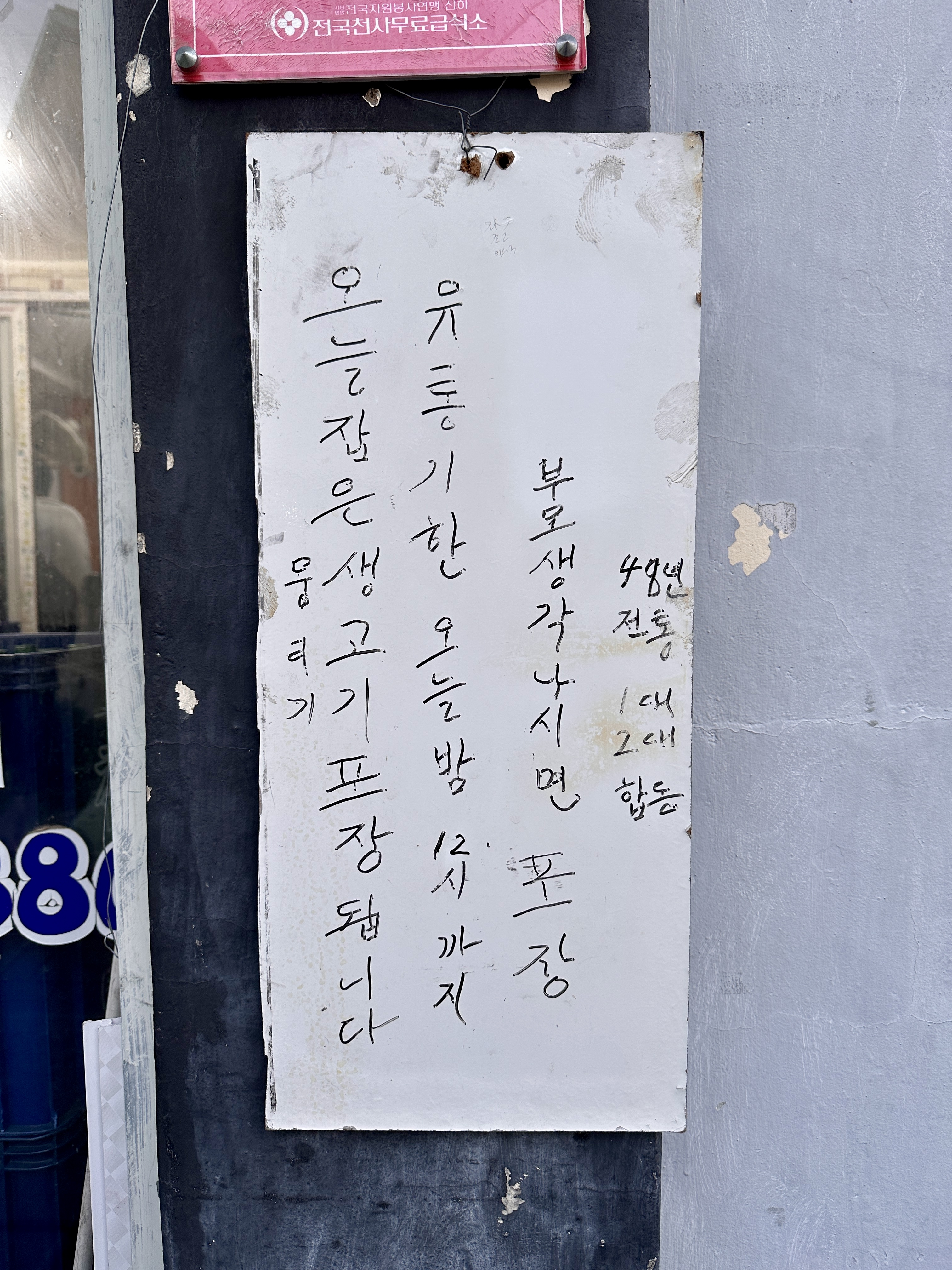 다행히도 옆 테이블에 등장한 오드래기의 모습을 슬쩍 보곤, 아주 나중의 인연으로 미루잔 판단이 섰습니다. 이름만 들으면 흥미롭긴 한데, 보니 맛이 예측이 되는 차돌, 양지, 힘줄 직화구이. 뭐랄까, 대개 대구가 이런 식이었습니다. 재미난 말장난들이 많았습니다.