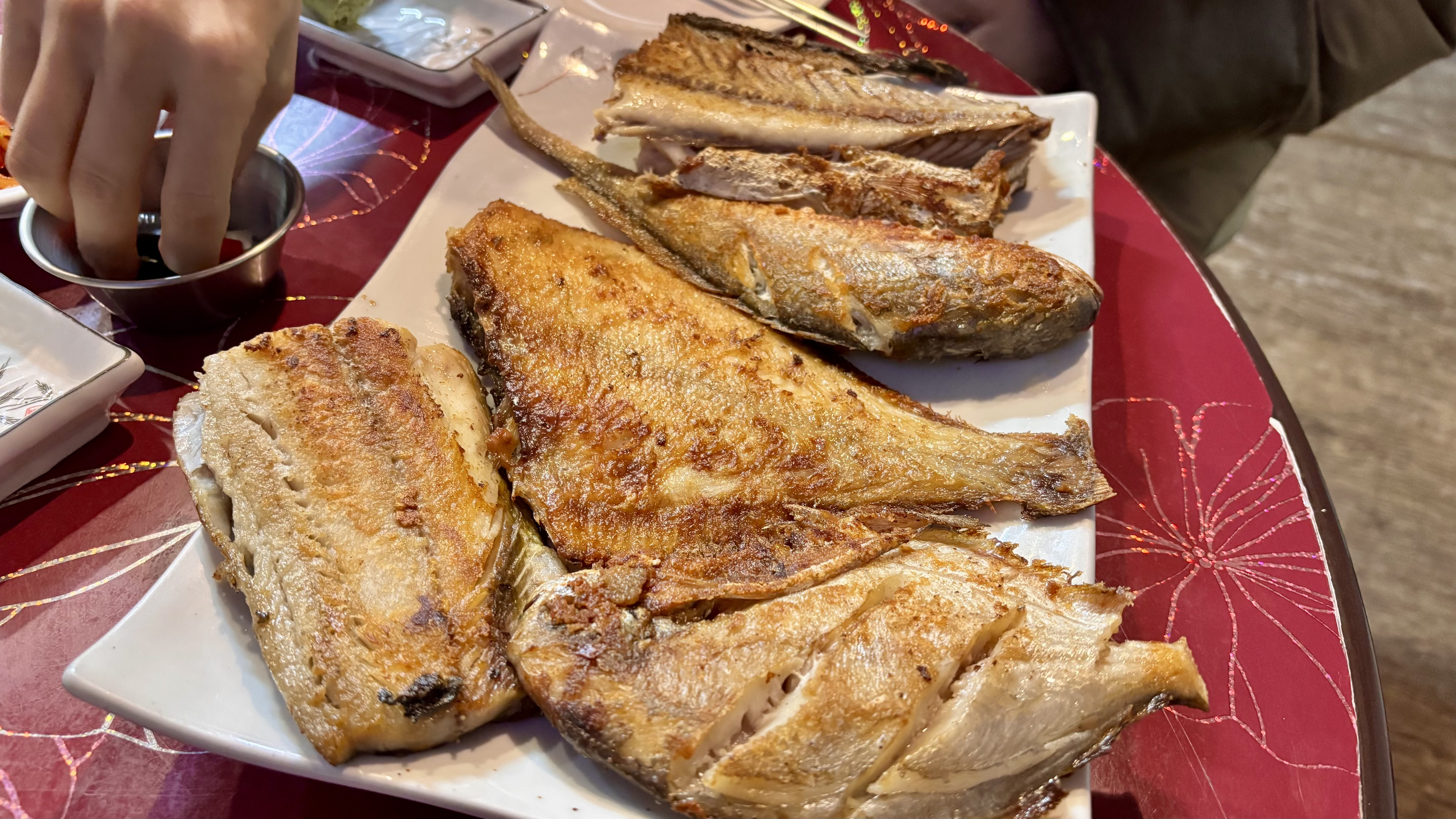 등장한 메인, 생선구이입니다. 이 정도면 푸지게 등장했네요. 삼치, 병어, 가자미, 조기의 구성입니다. 가자미의 간이 센 건 있었지만 막걸리와 즐기기엔 괜찮았습니다.