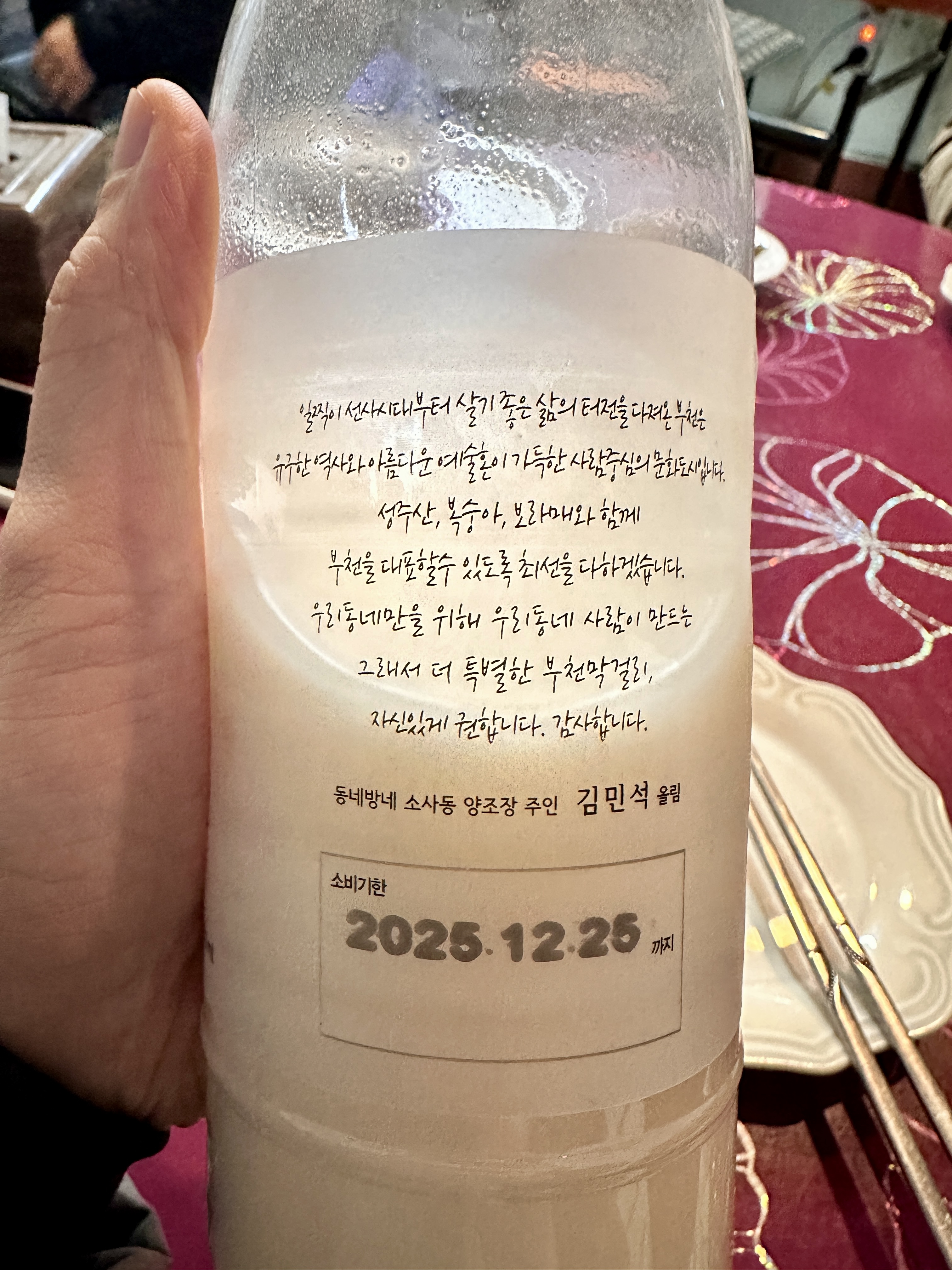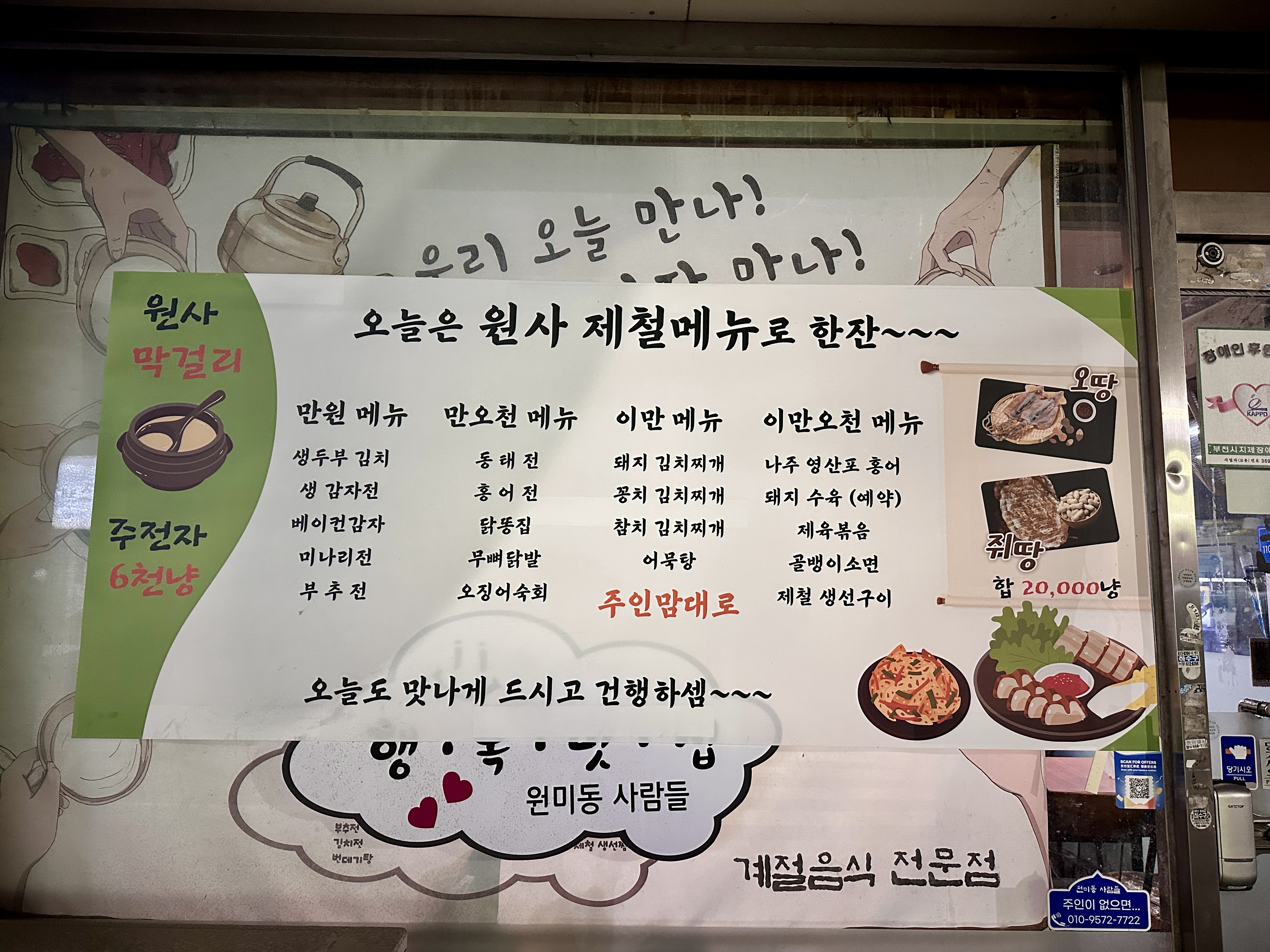 주전자 막걸리인 원사 막걸리는 송명섭막걸리를 썼었는데, 지금은 없다 하시네요. (접한 적이 있는데 아스파탐이 첨가되지 않은 당도가 없다시피 한 막걸리입니다.) 동네방네 부천 막걸리로 대신했습니다.