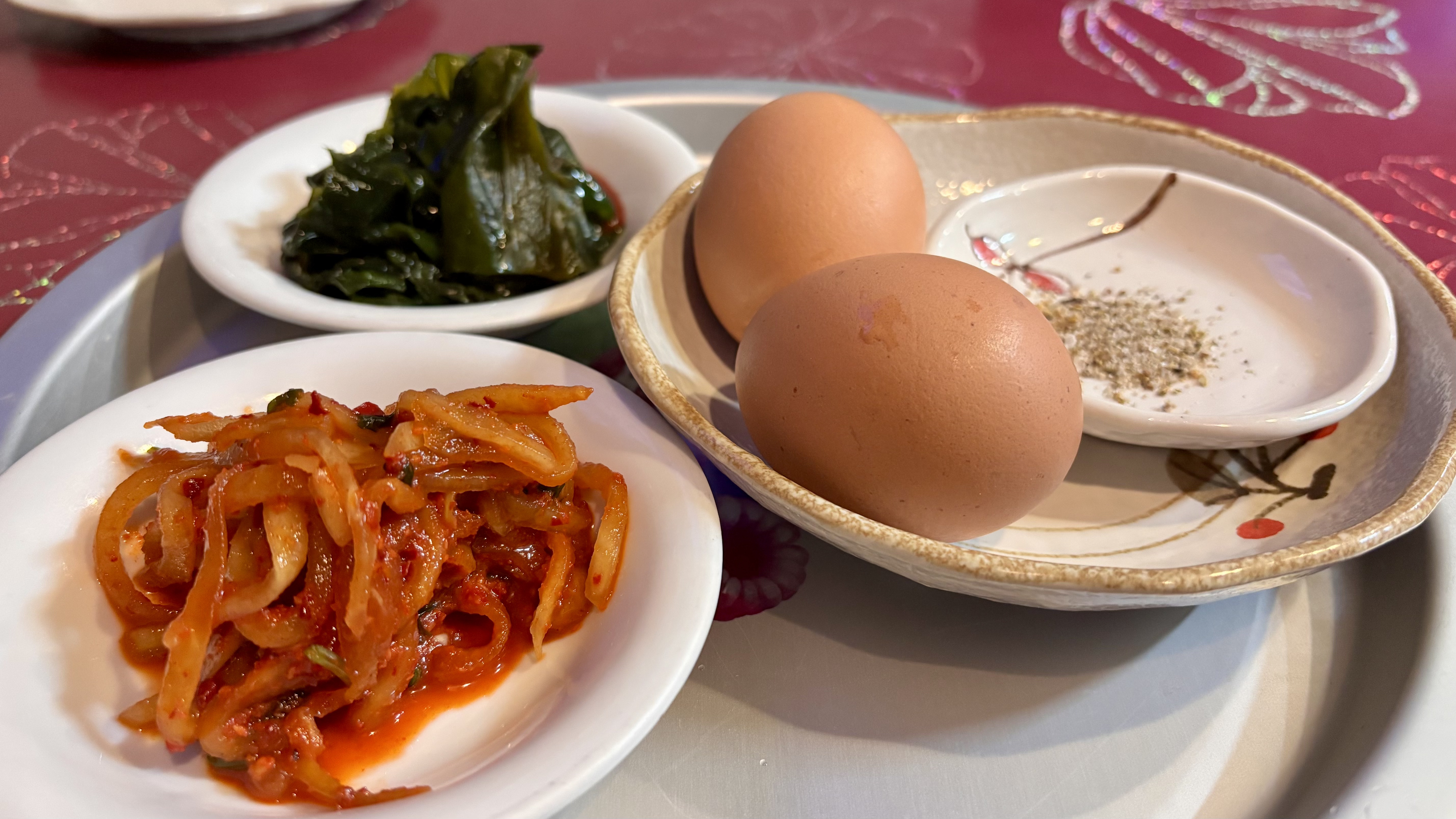 먼저 기본 안주입니다. 특이하게 반숙란도 함께였습니다. 향신료 고수의 향이 나는 무생채는 음, 독특한 킥이구나 솔직하게 어렵도다 했구요.