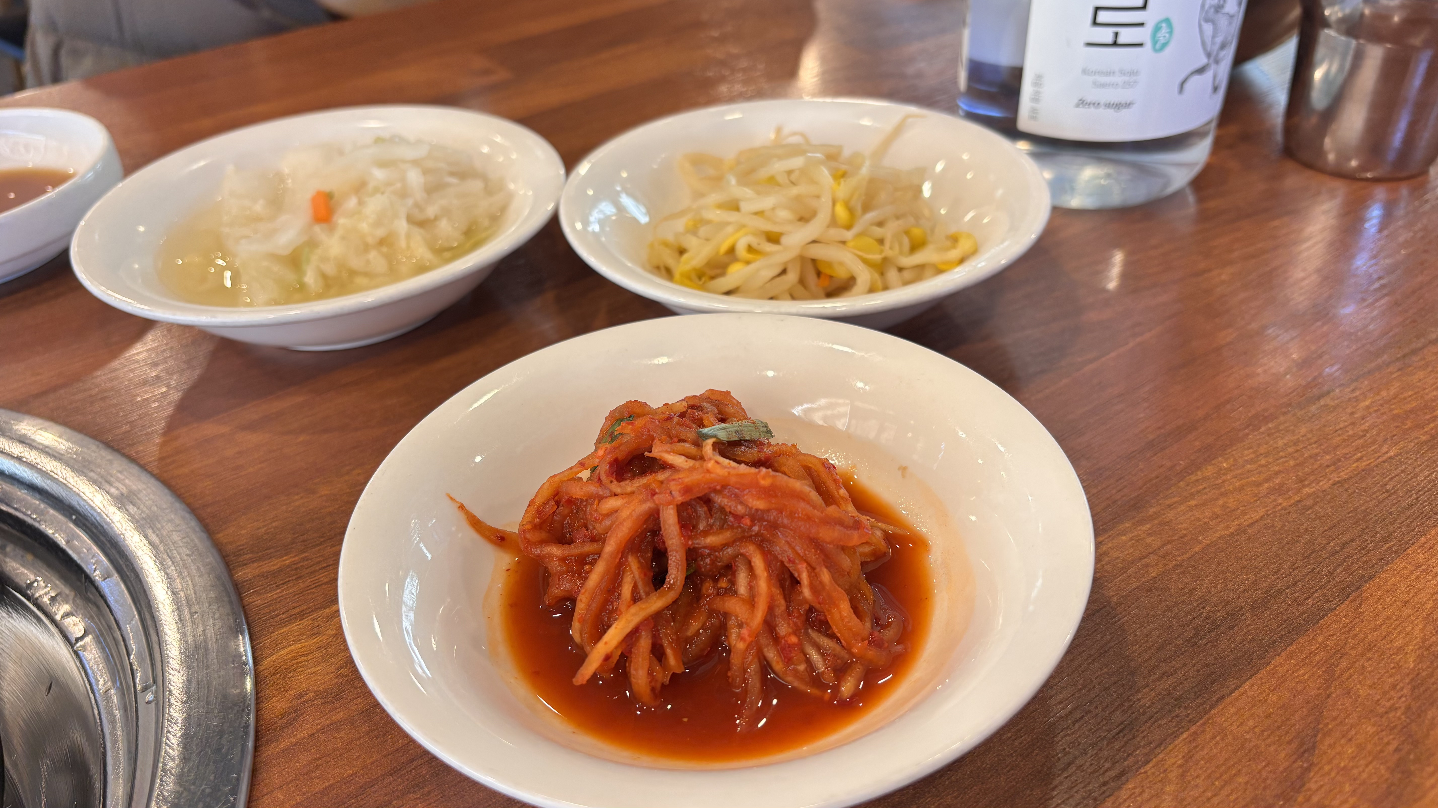 세팅된 기본 찬입니다. 매콤한 편의 양념 진한 무생채와 콩나물, 백김치입니다. 얼핏 보니 이것도 본점 ‘시골식당’의 구성을 따라가는 듯했습니다.