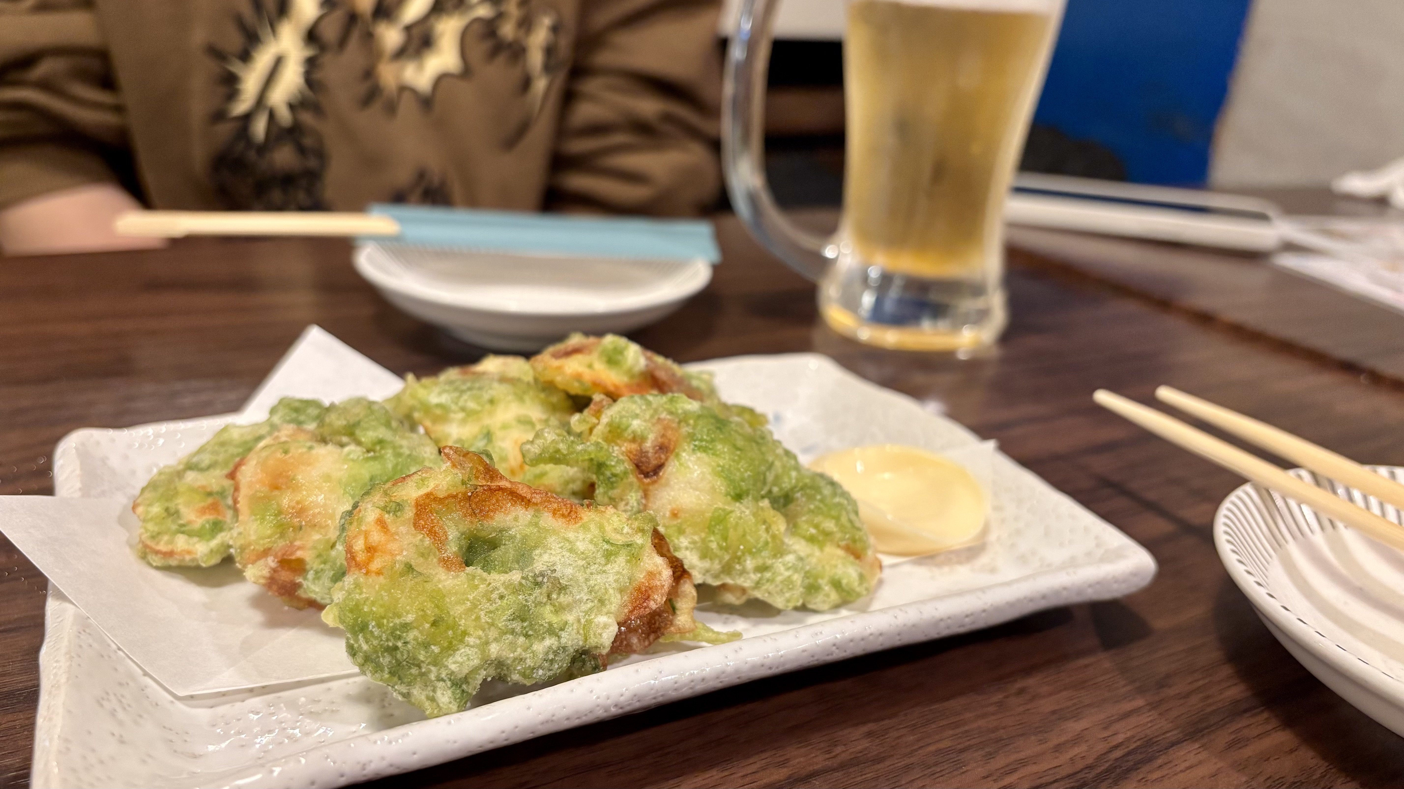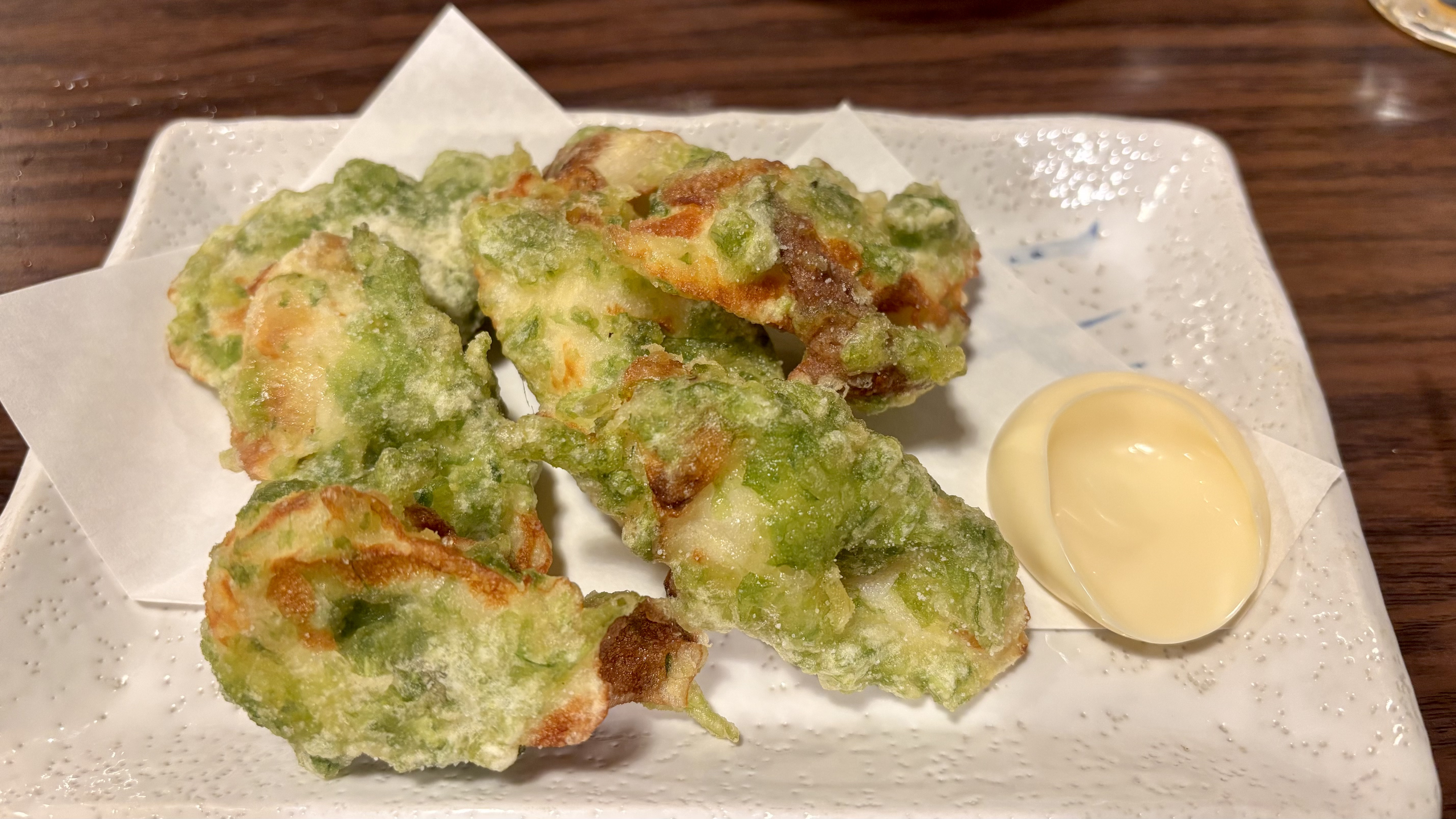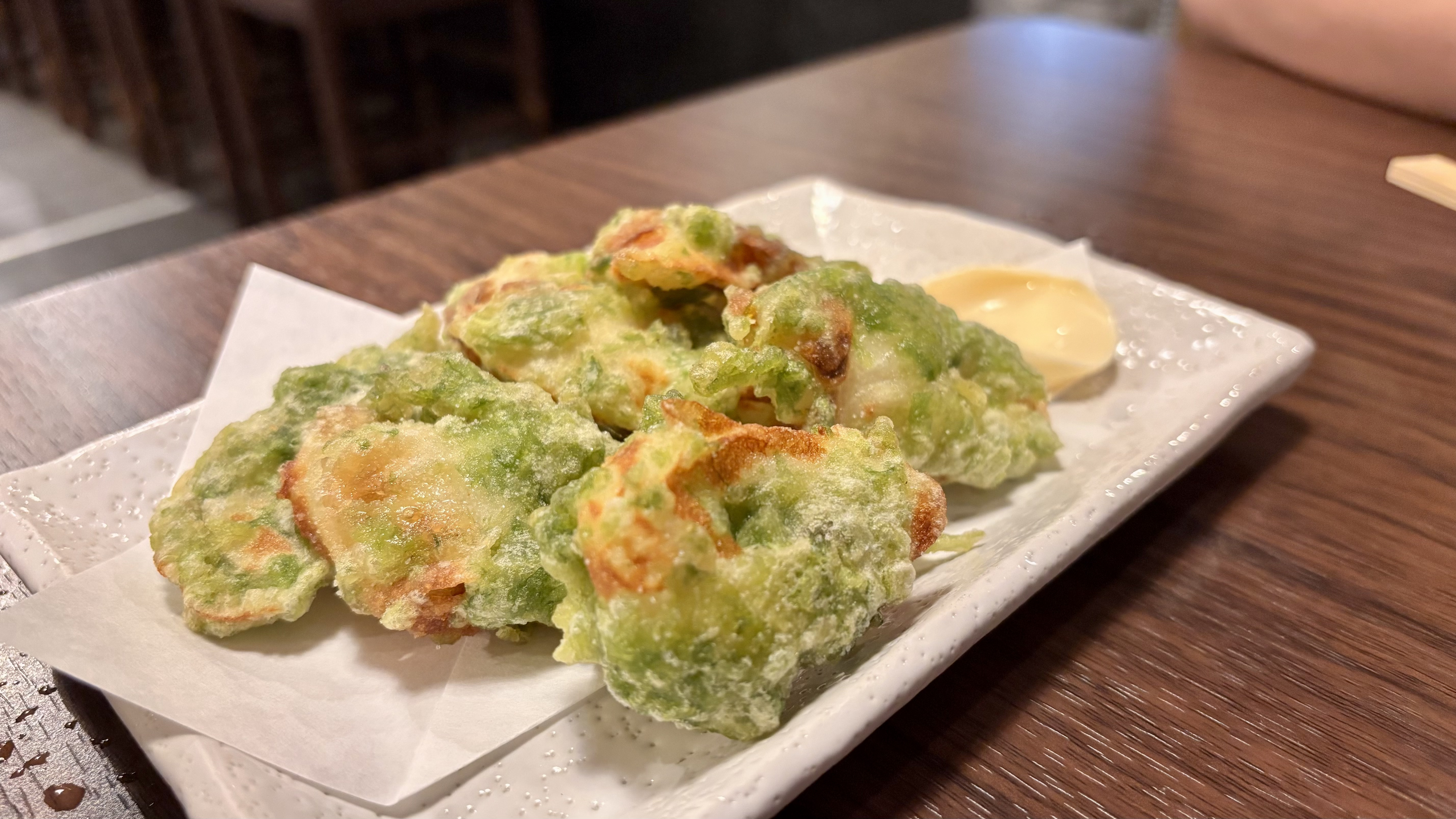 되게 별것 없긴 하지만 놓임새도 그렇고 뭔가 하나를 만들더래도 허투루 내놓지 않는 곳이 일본식 안주란 생각입니다. 파래 반죽으로 치쿠와 어묵을 튀긴 어묵튀김이었습니다.