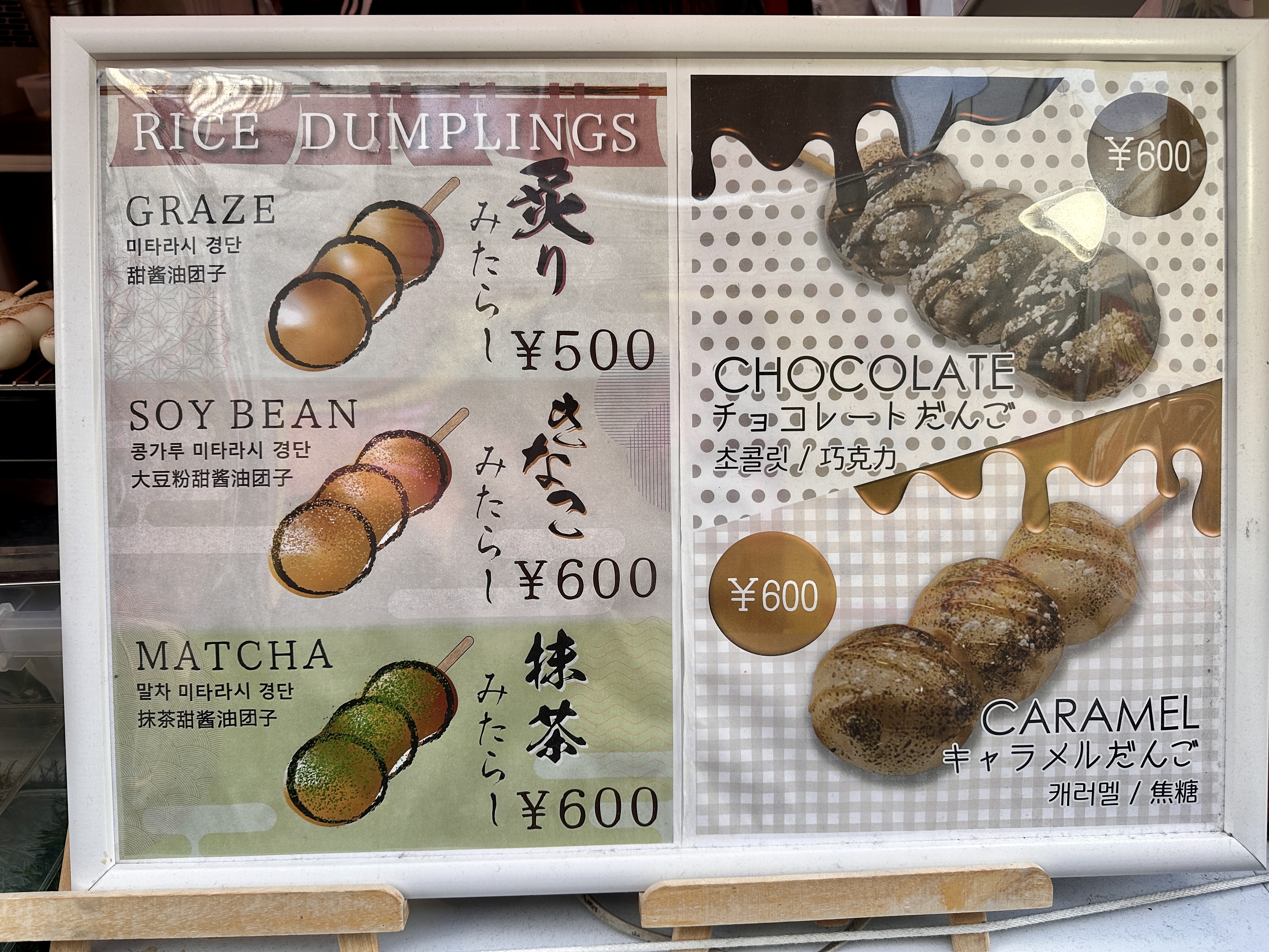 잠시 발걸음을 멈추고 메뉴판부터. 현금 결제만 가능했습니다. 당고는 개당 500 ~ 600엔 정도. 미타라시 베이스에 콩가루, 말차까지. 초코와 캐러멜에선 솔직히 으윽 했습니다. 조잡하지 않은 기본의 쇼유 당고, 미타라시 당고 1개를 즉석으로 구매했습니다.