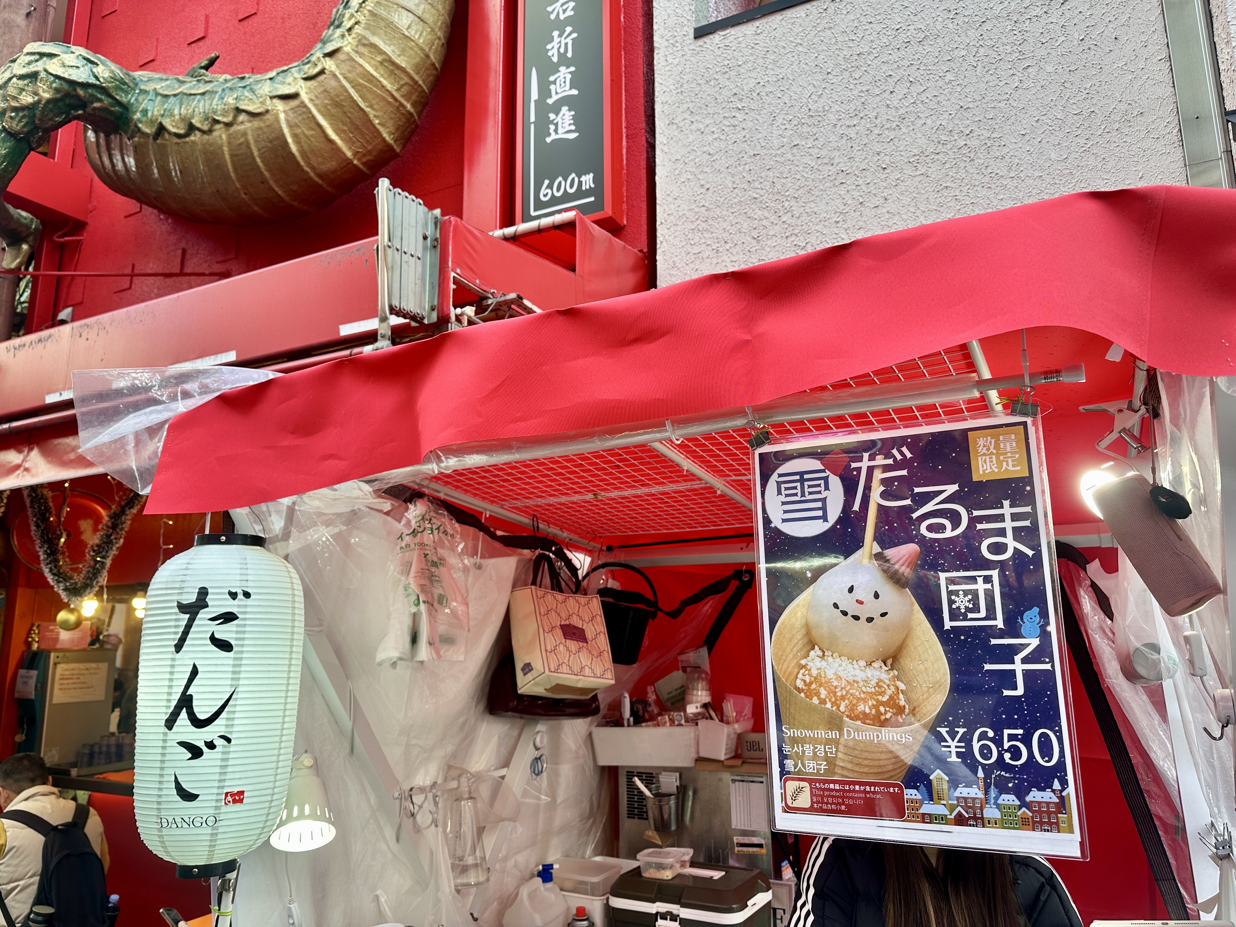 그렇게 걷다가 마주친 킨류라멘 분점의 간판 모형을 보고는 음? 원래면 꼬리만 달려있어야 하는데 머리도 달려 있네? 하고 지나칠 때쯤, 당고 가판대 하나를 맞닥뜨리게 됩니다. (이건 아마 본점이 공사 중이라 임시 조치를 취한 게 아닐까 싶네요.)