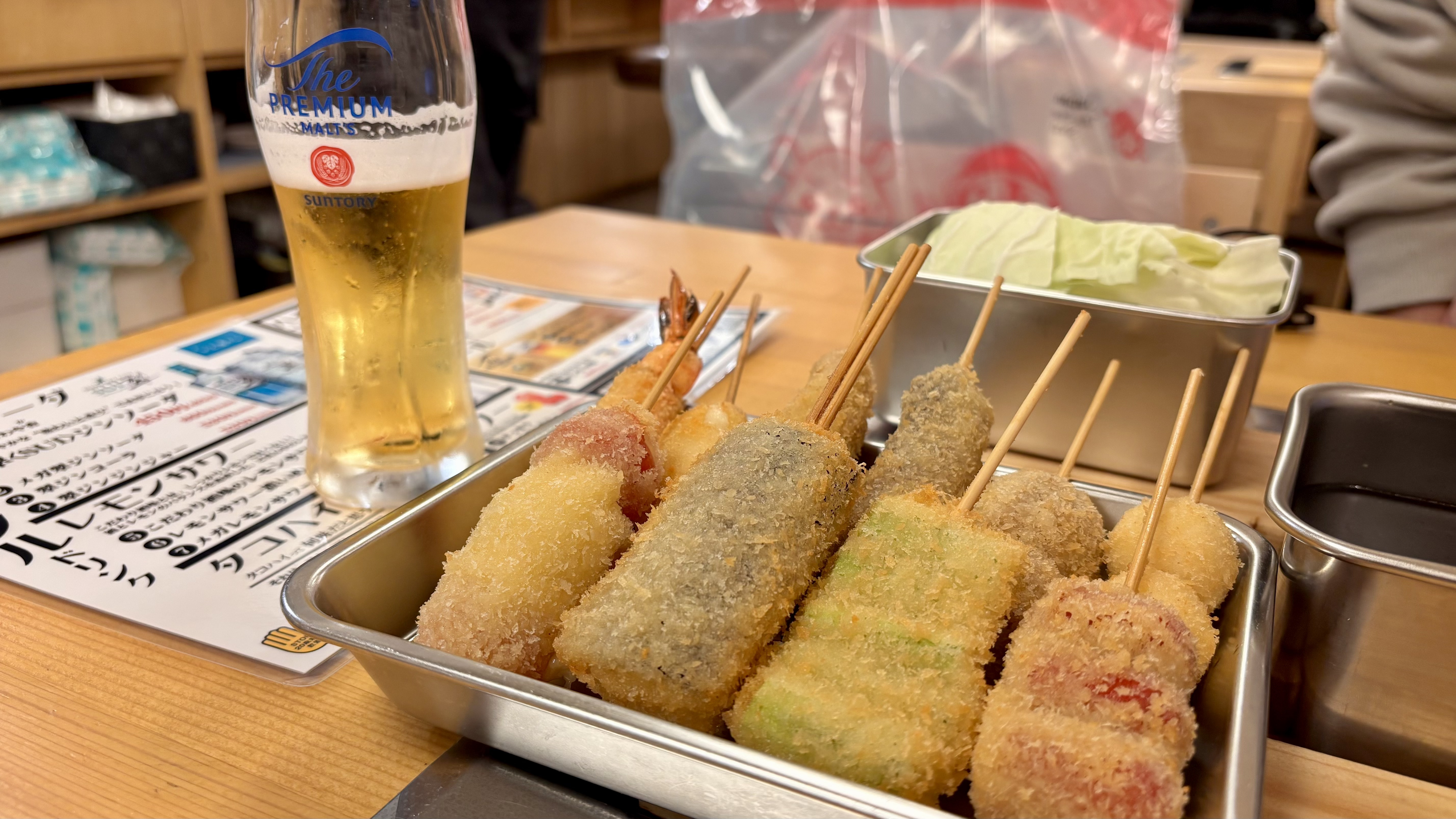 오사카 하면 빠질 수 없는 대표 음식입니다. 간장 소스에 푹 담가 양배추와 곁들이는 꼬치 튀김, 쿠시카츠. 이번 오사카 겨울 여행 중 튀김을 얕보던 연인에게 소개하고픈 마음이 컸던 메뉴이기도 했습니다. 젊은 기억이긴 하지만 오사카를 처음 찾았을 당시 ‘쿠시카츠 다루마 본점’에서 만난 소혀 쿠시카츠의 기억은 강렬했었거든요. 일본의 튀김은 우리와는 근본적으로 다르고 진심이구나 처음 느꼈던 순간이기도 했습니다.