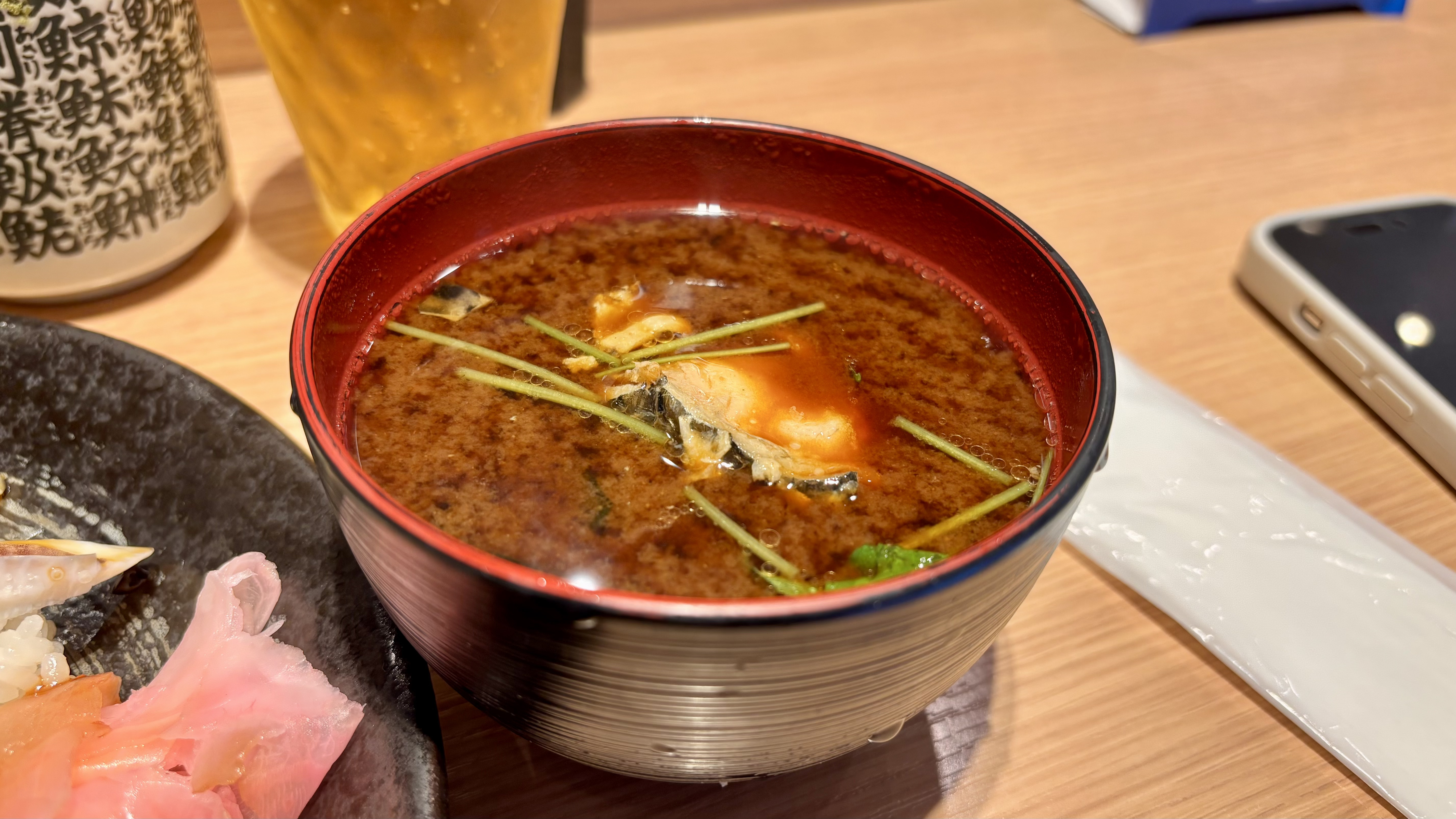 사진으로 봐도 진하지 않나요? 같이 나온 진한 된장국. 우리나라의 찌개까진 아니지만 그에 준하는 진한 맛이 느껴진 된장국이었습니다. 후에 알아보니 아카미소라는 붉은 된장에 생선 머리를 넣고 끓이는 오사카만의 방식이라고 하네요.