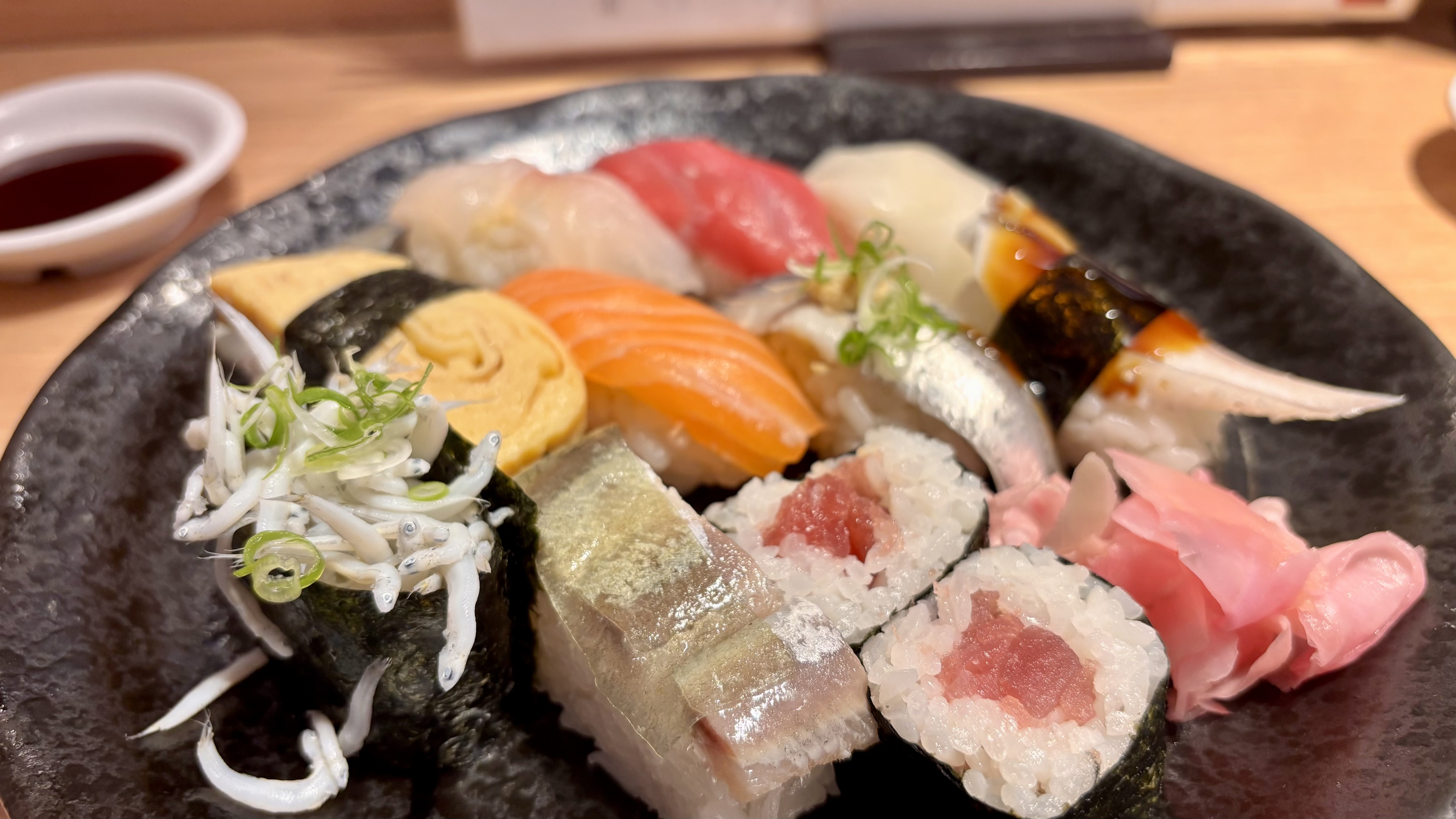 등장한 런치 세트입니다. 한 접시에 모여 등장했습니다. 가장 먼저 관심이 쏠린 건 맨 앞의 잔멸치 군함말이. 시라스즈시로 잔멸치 스시입니다. 완전 생까지는 아니어도 살짝 절여진 생멸치에 가까운 식감. 비린 맛은 없었습니다.