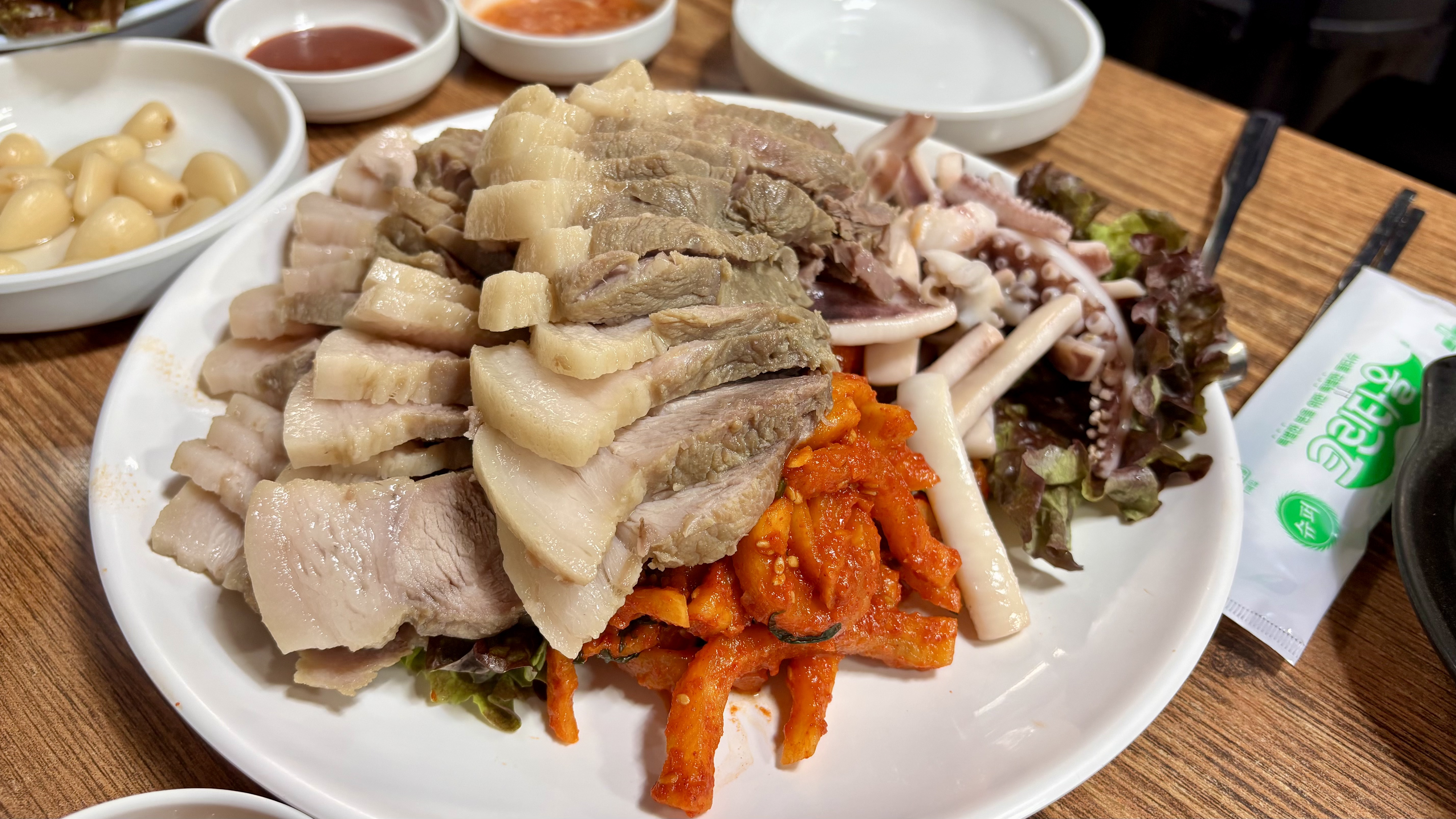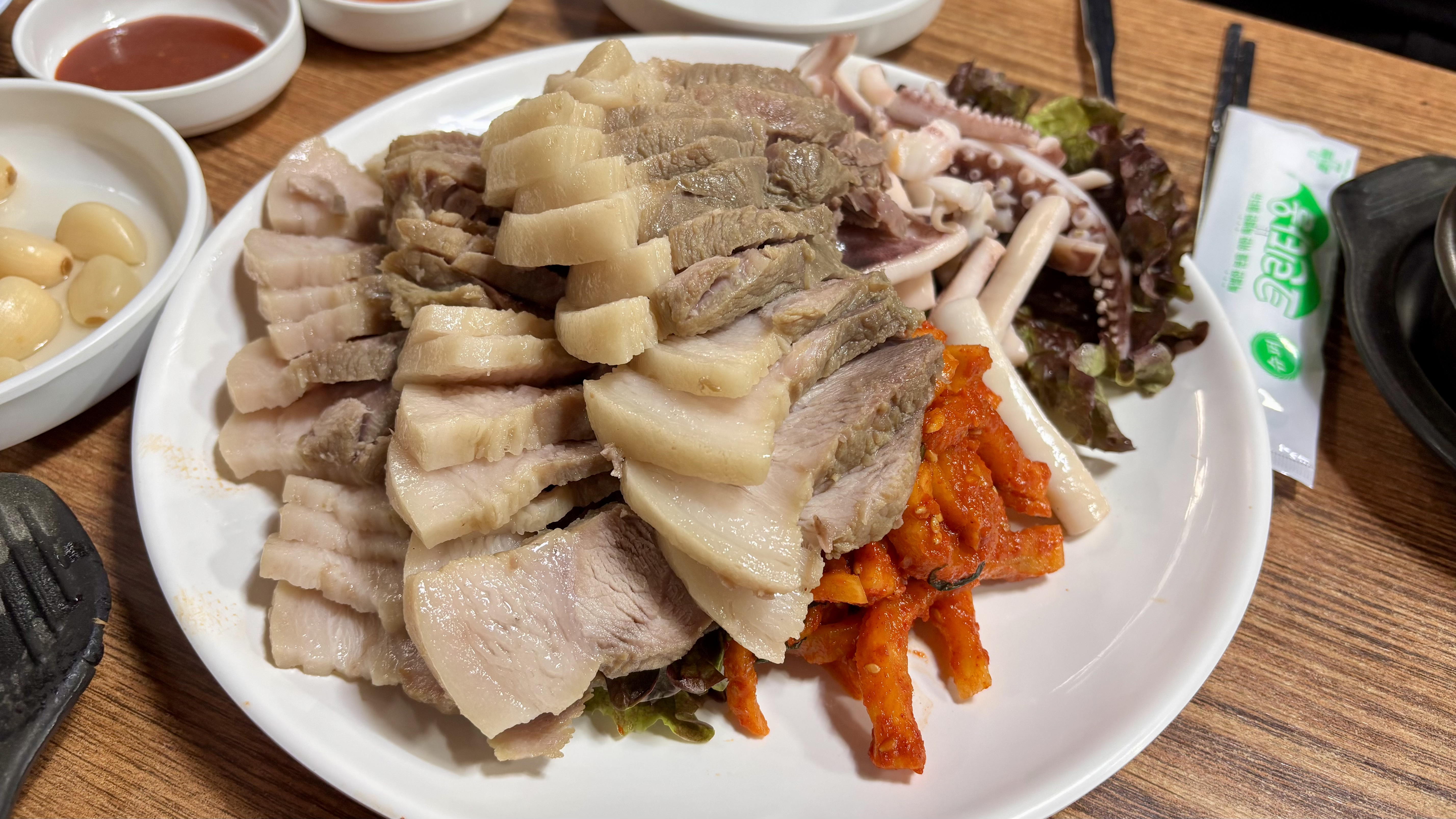 금방 보쌈이 등장했습니다. 메뉴 디테일에 관한 정보는 없었던 상태라 굴김치처럼 오징어를 김치에 섞나 했는데, 숙회로 삼합처럼 등장하는 구성입니다.