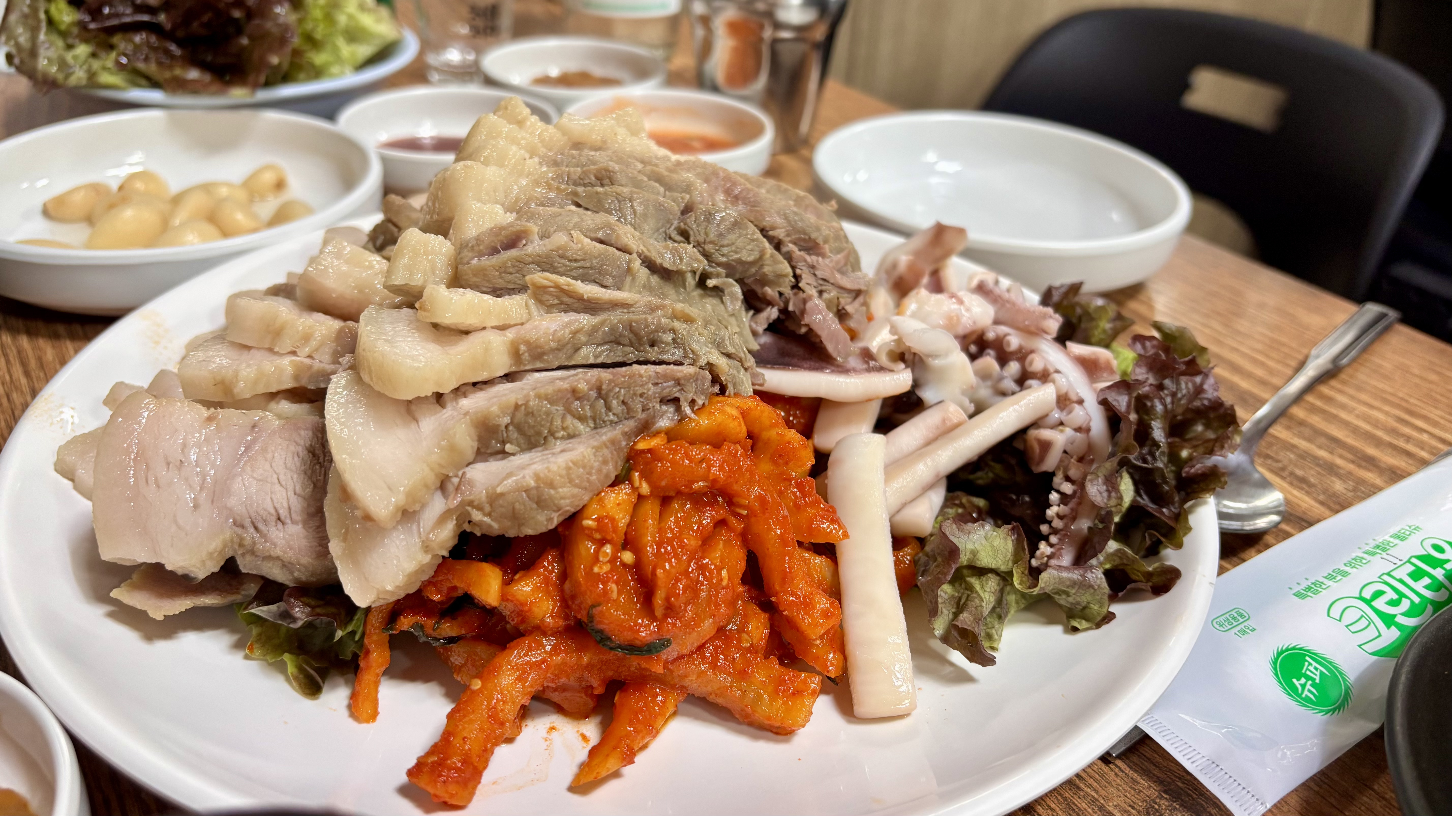 첫맛에 음, 잘 삶은 보쌈이다 느껴지긴 했는데, 솔직히 그리 큰 임팩트는 느끼지 못했습니다. 오징어를 곁들여도 그저 하나 더해진 맛으로 잘 섞이는 듯한 조화로움은 덜했고 말입니다. 그래도 위치적인 부분도 그렇고 많은 테이블수며 소소한 모임의 장소로는 괜찮겠다 싶었습니다.