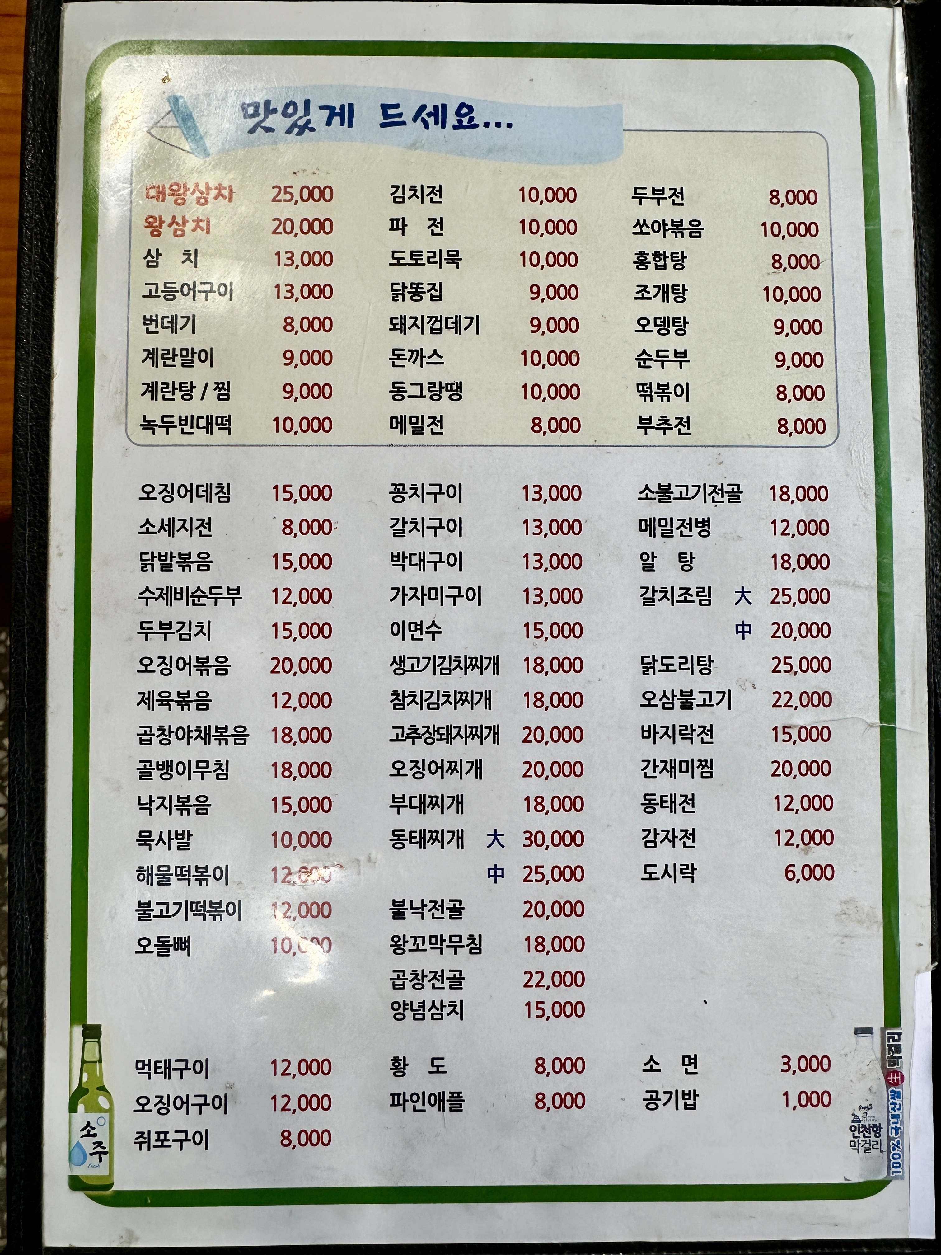 자리를 잡고는 메뉴판입니다. 상당하네요. 근래 본 메뉴판 중 가장 가짓수가 많지 않았을까? 메뉴 스펙트럼이 정말 넓다는 생각을 했습니다. 무엇보다도 상호가 전동포차 아닌 삼치이니 당연히 삼치에만 큰 의의를 두고 있을 줄 알았는데, 그게 아니란 게 의외였습니다.