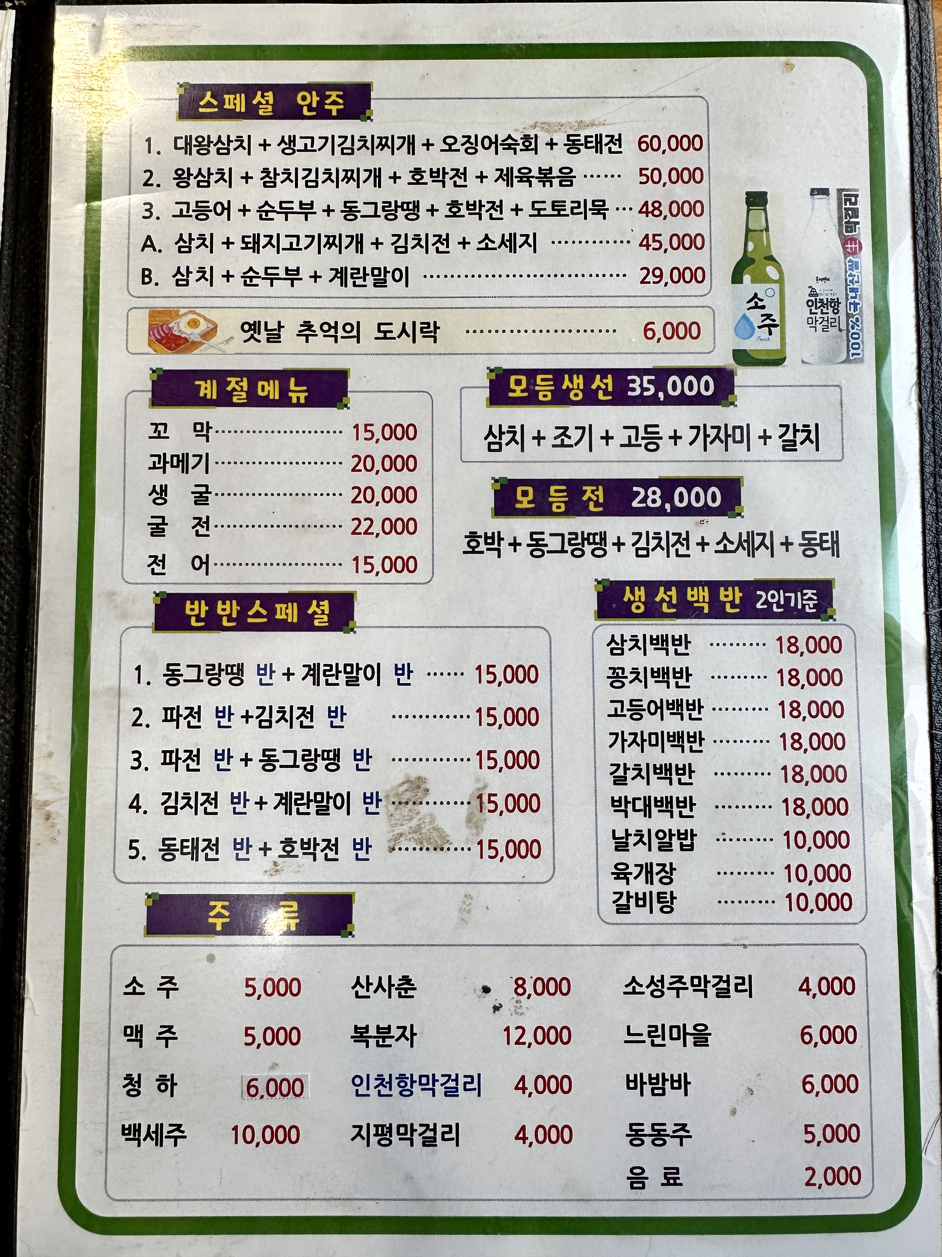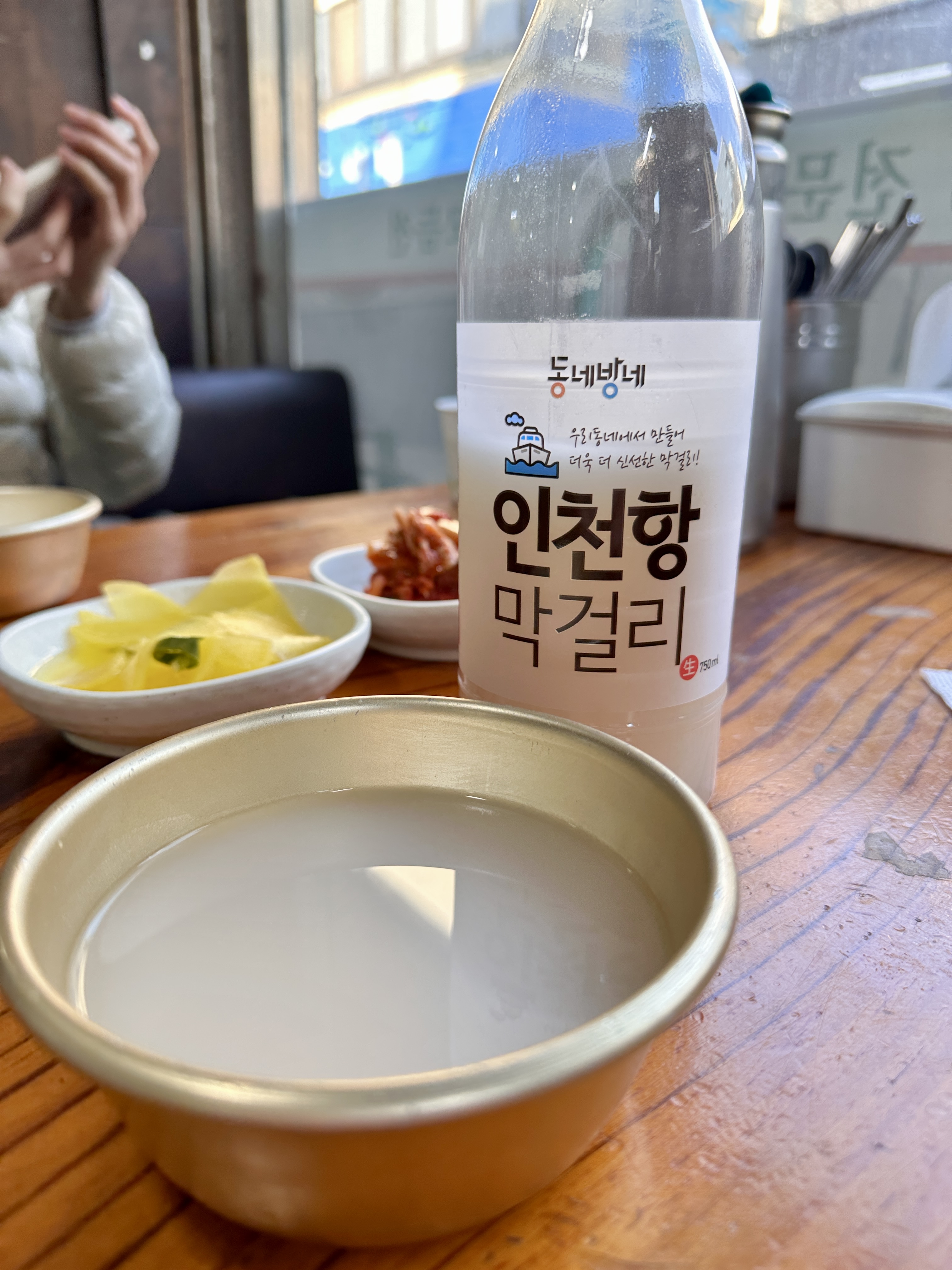 안주 세트로 주문을 했구요. 주류 쪽을 보니 소성주 외 인천항막걸리란 것도 있구나! 하고 순간 반가워했는데, 아쉽게도 동네방네 막걸리.