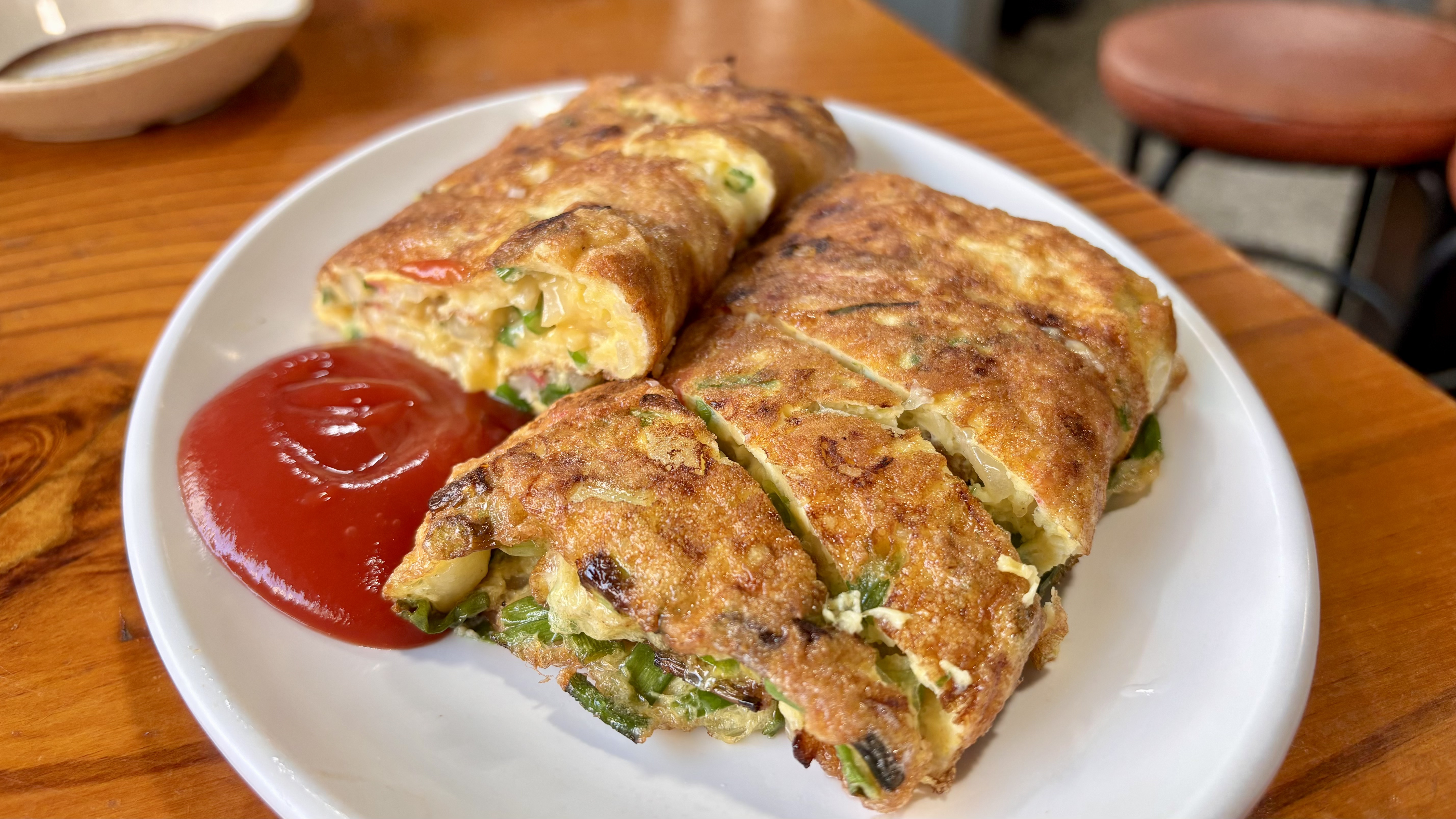 세트가 등장하기 시작합니다. 먼저 계란말이는 농담 삼아 개항의 동네라 그런지 케첩 듬뿍의 스타일입니다. 파와 양파, 게맛살이 첨가된 계란말이였는데, 파가 주는 식감이 좋았습니다. 좋아하는 스타일입니다.