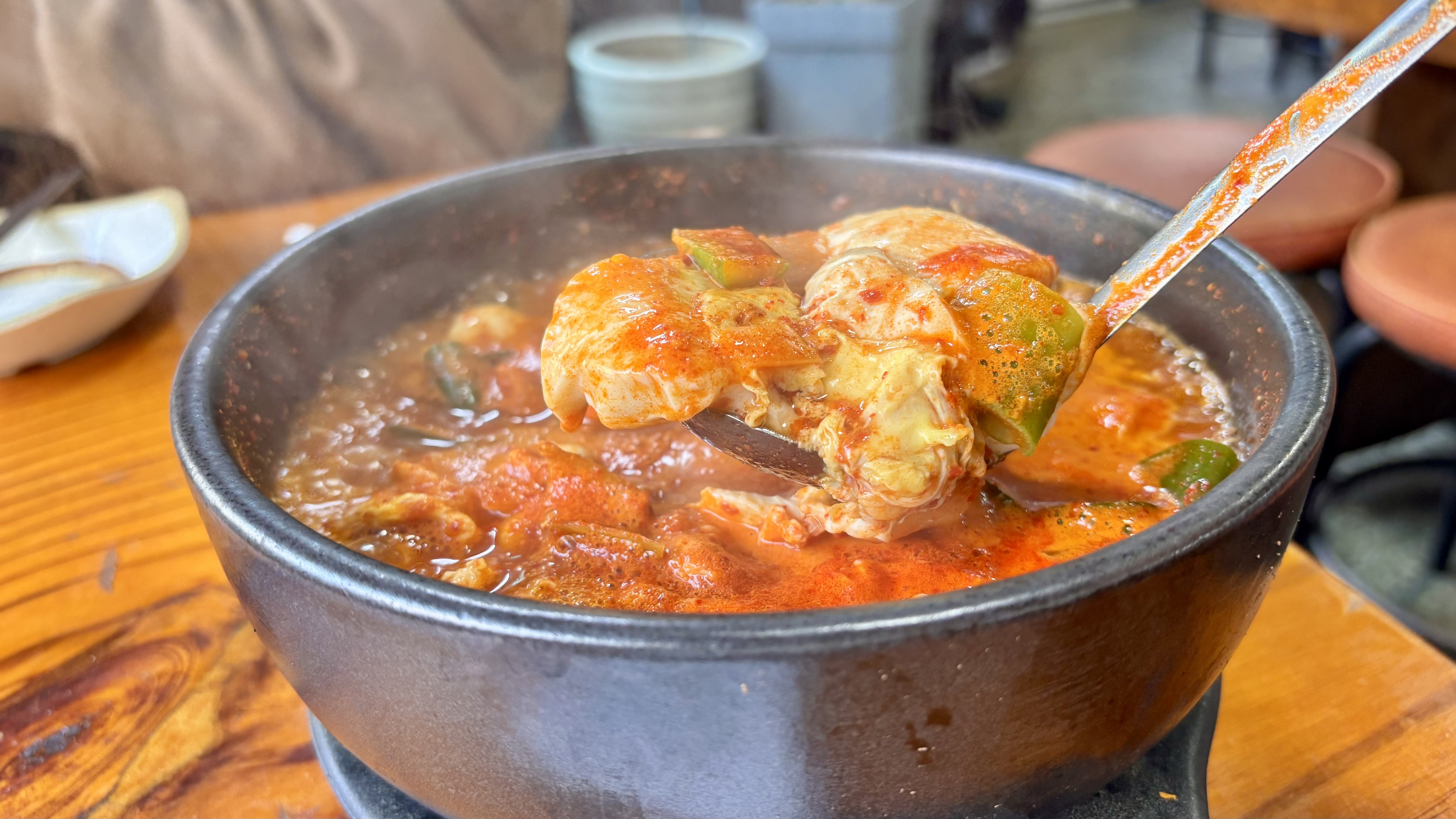 순두부찌개는 굉장히 투박하고 칼칼한 찌개. 막상 순두부찌개라 하지만 농도가 옅어 탕에 가까울 때가 많은데, 여긴 정말 찌개스럽게 진한 탕이었습니다. 필자는 마음에 들었으나 연인은 약간 반대였나 봅니다.