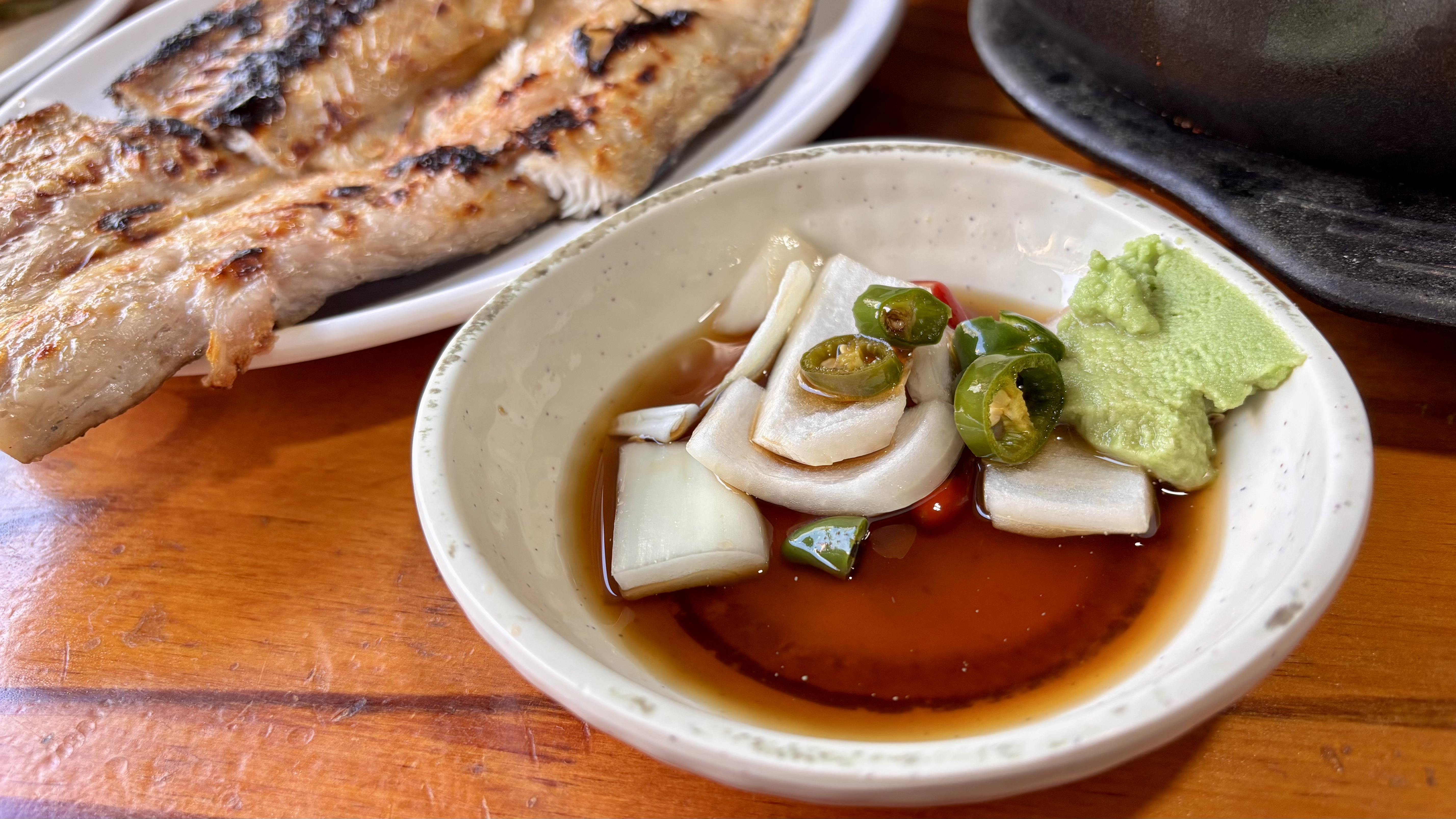 이건 삼치를 찍는 양념장인데, 여기서도 익숙지 않은 특이한 조합은 마찬가지였습니다. 와사비 양파장입니다. 종지에 한 번에 들어있는 건 처음 본 것 같습니다.