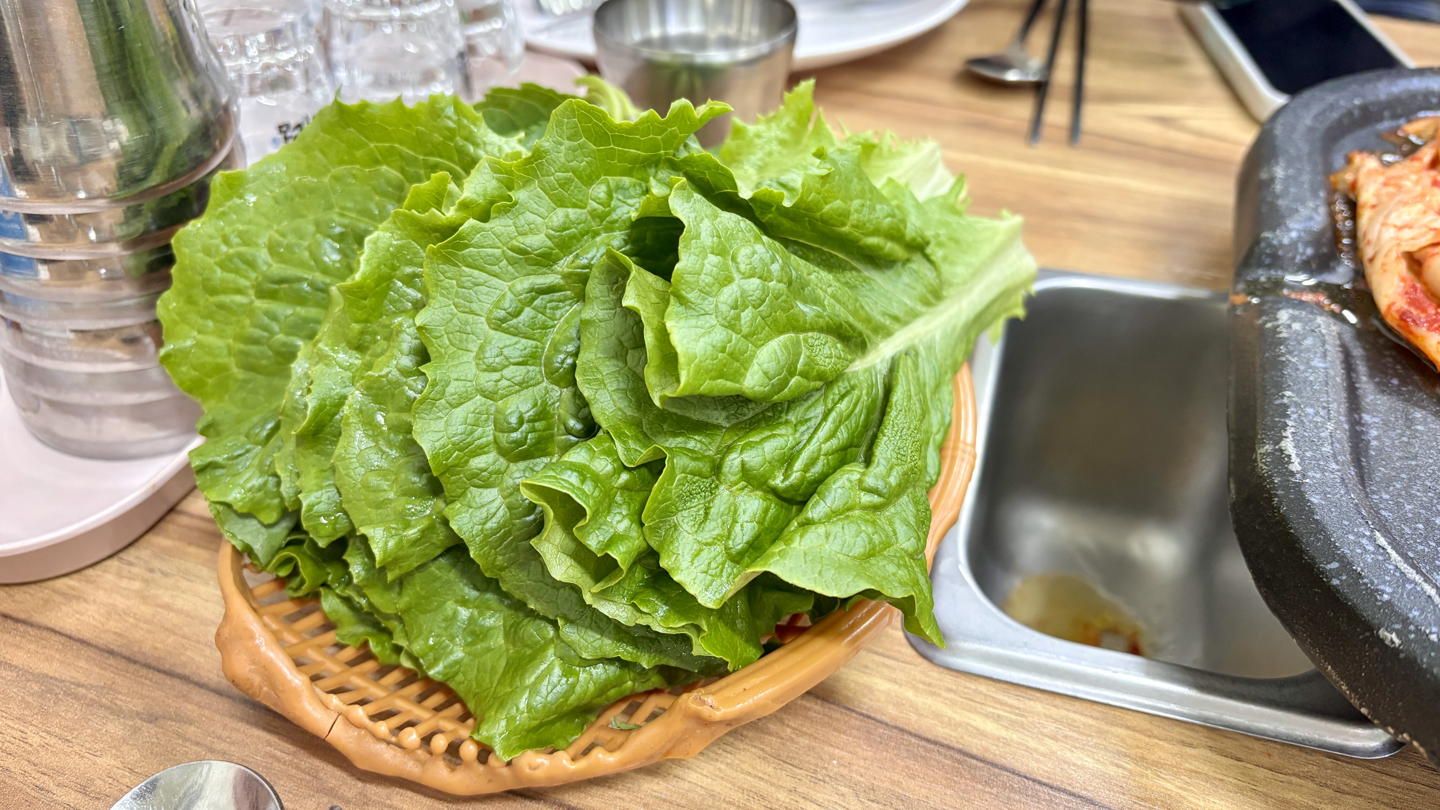 - 13종의 찬과 찌개와 넉넉한 쌈 채소, 삼겹살 2인분을 시킨 건지 쌈밥집에 온 건지 모르겠다.