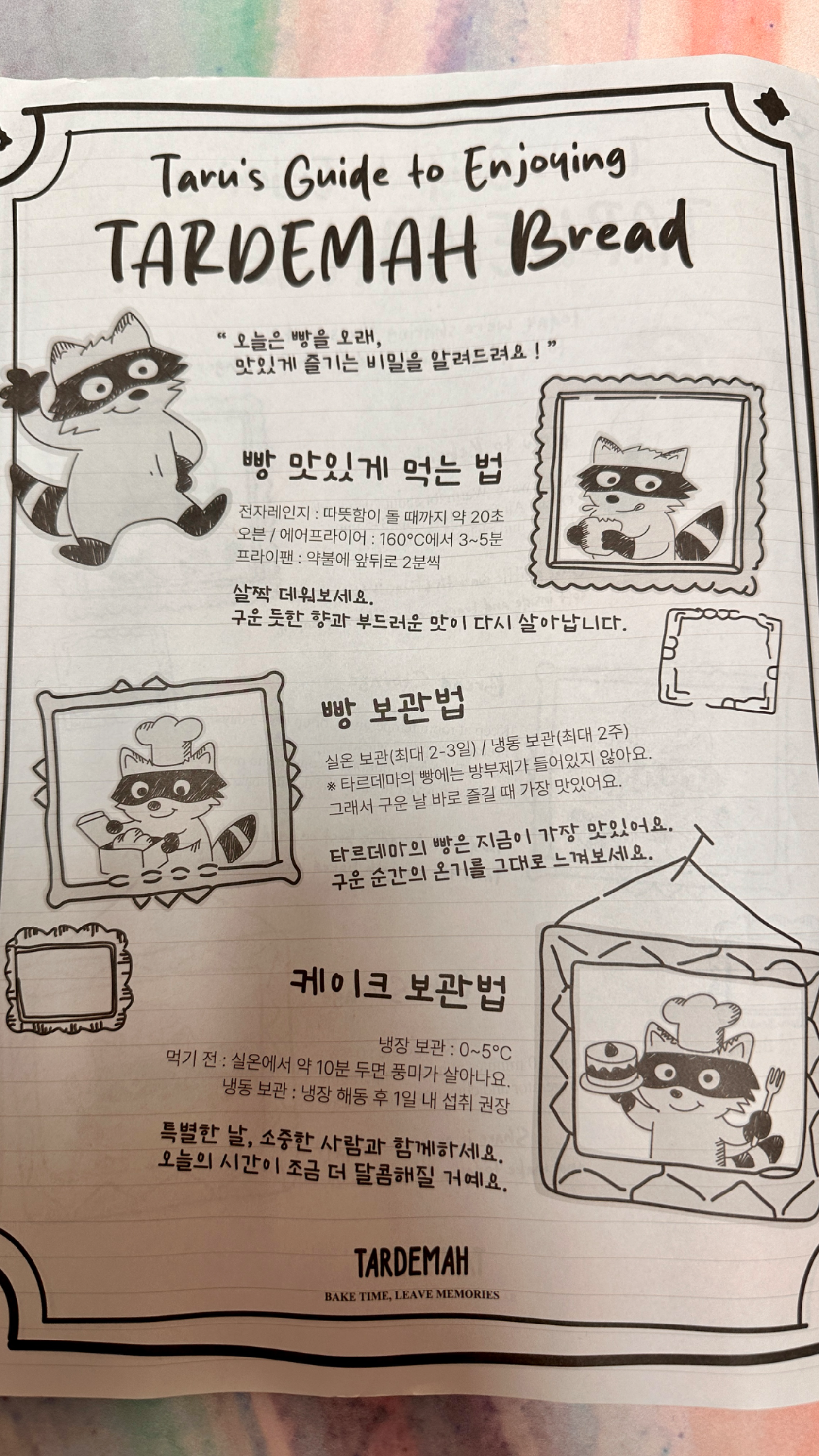 맛있게 먹는 방법 종이를 펼치는데 아, 캐릭터는 너구리였나? 곰돌이 아닌 너구리를 보고 나니 타르테마란 상호가 너구리에 더욱 어울리는 것 같기도 하네요. 이 역시 타누키(너구리의 일본어)와 시작이 비슷해 그렇게 느꼈나 봅니다. 맛있게 먹는 방법을 참고해 조금 데웠고, 본격적인 시식 시작입니다.