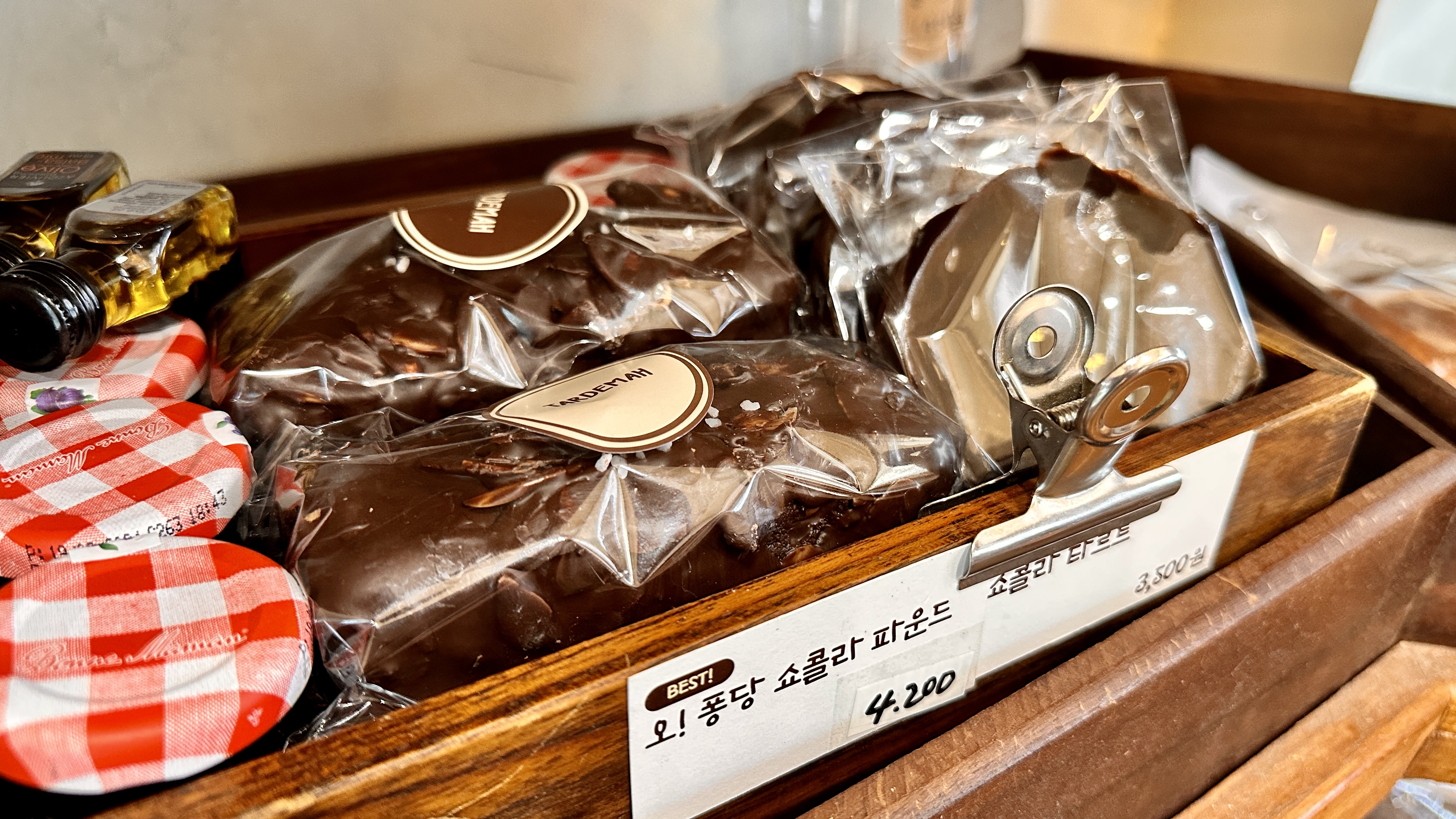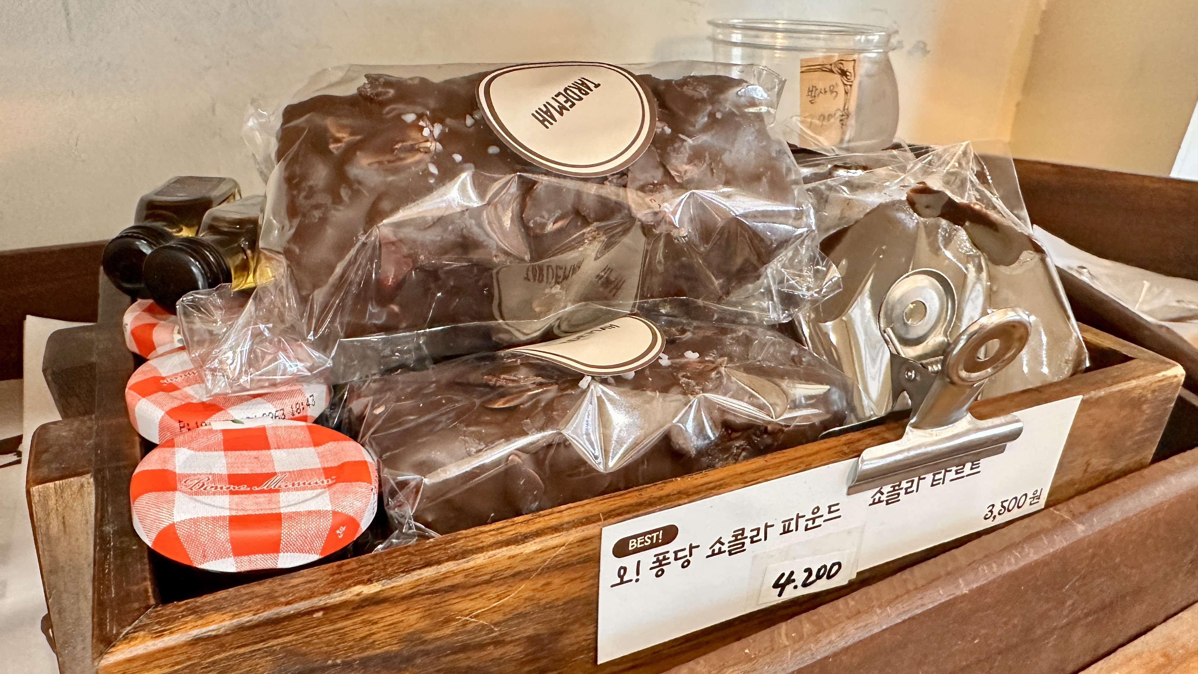 여하튼 왔으니 빵을 집어보자 하는데, 주말 늦은 오후 도착한 터라 이미 빵들은 동이나 있는 상태였습니다. 고를 선택지가 몇 개 없었기에 이 오밀조밀한 내부를 사진으로 담는 정도로 부족함을 채우고자 했네요. 보니 청주의 가성비 케이크 ‘우리베이커리’와 거의 똑같이 생긴 초코케이크도 보입니다. 이곳에선 초코키리쉬라 불리고 있었습니다.