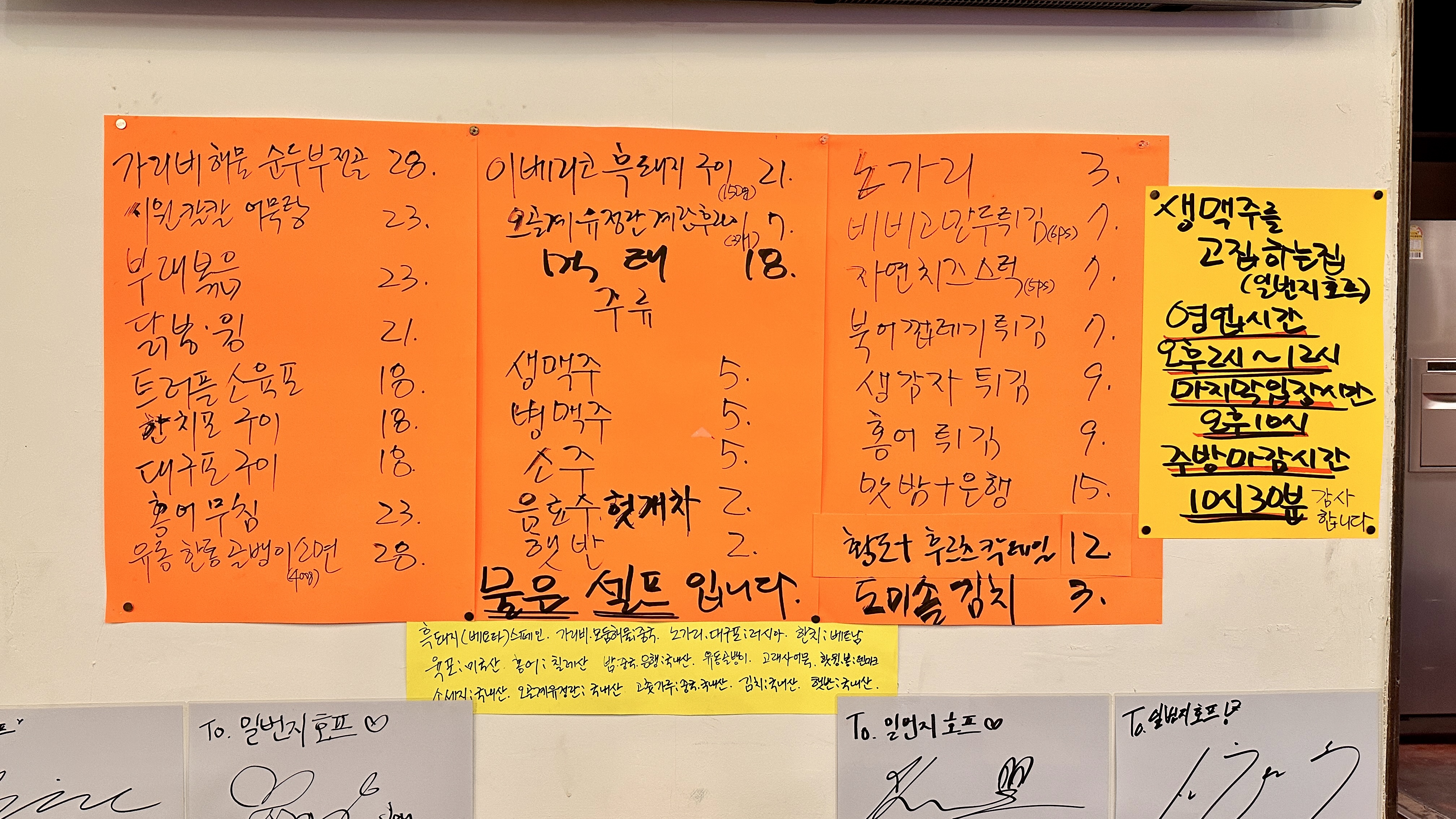 그 시점에 그냥 이대로 버스를 타고 돌아가 말어를 두세 번 정도 고민했던 것 같네요. 찰나에 돌아보자 우연히 보이는 생맥주를 고집하는 집이라는 ‘일번지호프’. 대한민국 정상 생맥주와 세계 4대 진미(?)를 포함한 요리란 과한 문구에서 멈칫했는데요. 하긴 토종 호프는 저런 맛이 있긴 하지, 하는 이끌림도 있었습니다.