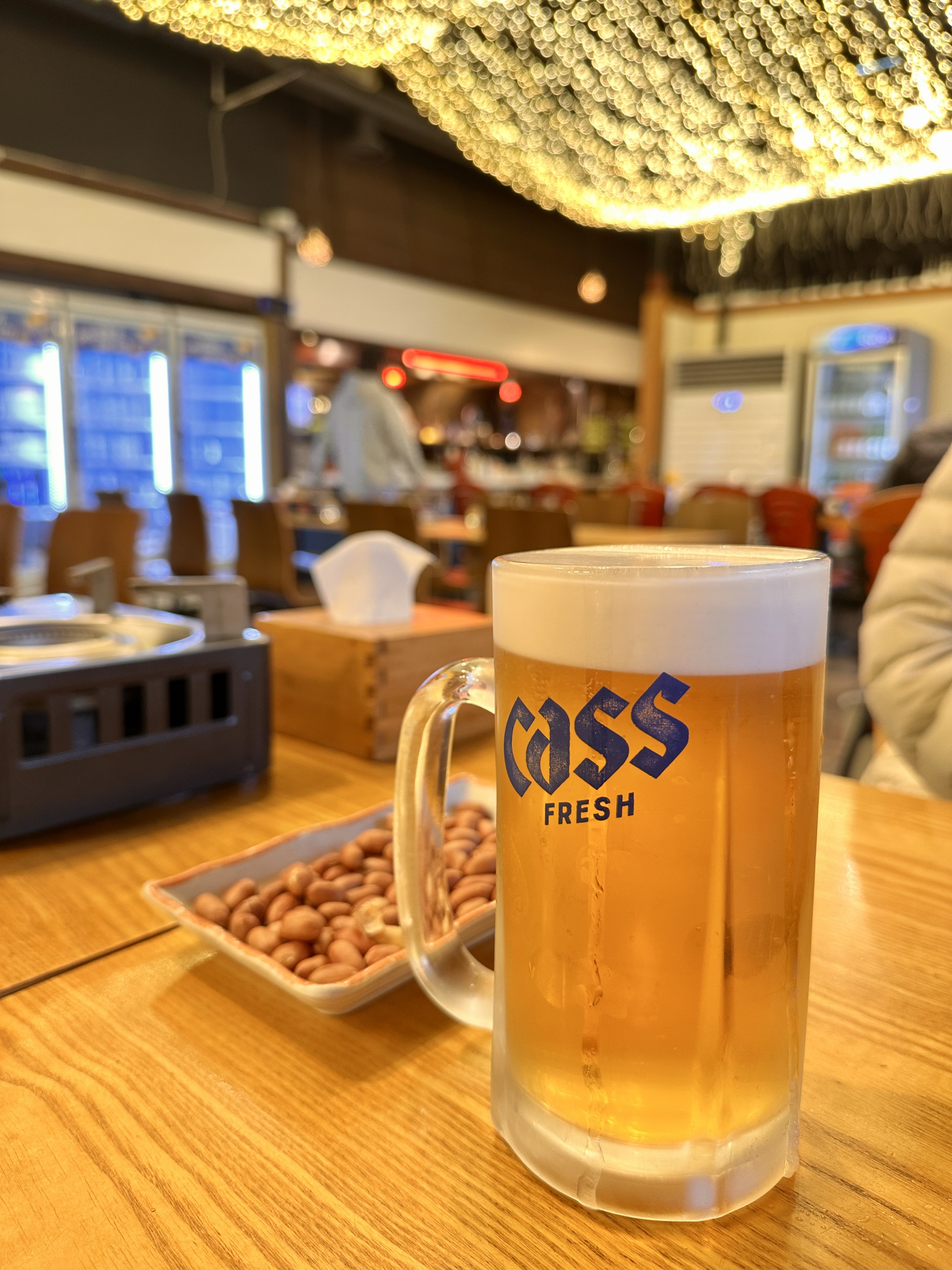 정석이네요. 기본 안주는 땅콩. 생맥주와 땅콩입니다. 엔젤링 생맥주라는 건 정확히 모르겠지만 기포가 아주 작고 자글자글하게 올라오는 게, 좋지 않은 맥주와는 차이가 좀 느껴졌습니다. 맛있게 시원하게 목을 타고 들어갔습니다. 그래서인지 생맥주 5잔 주문 시 천연 콜라겐 북어껍데기 증정 이벤트도 진행 중이라네요.