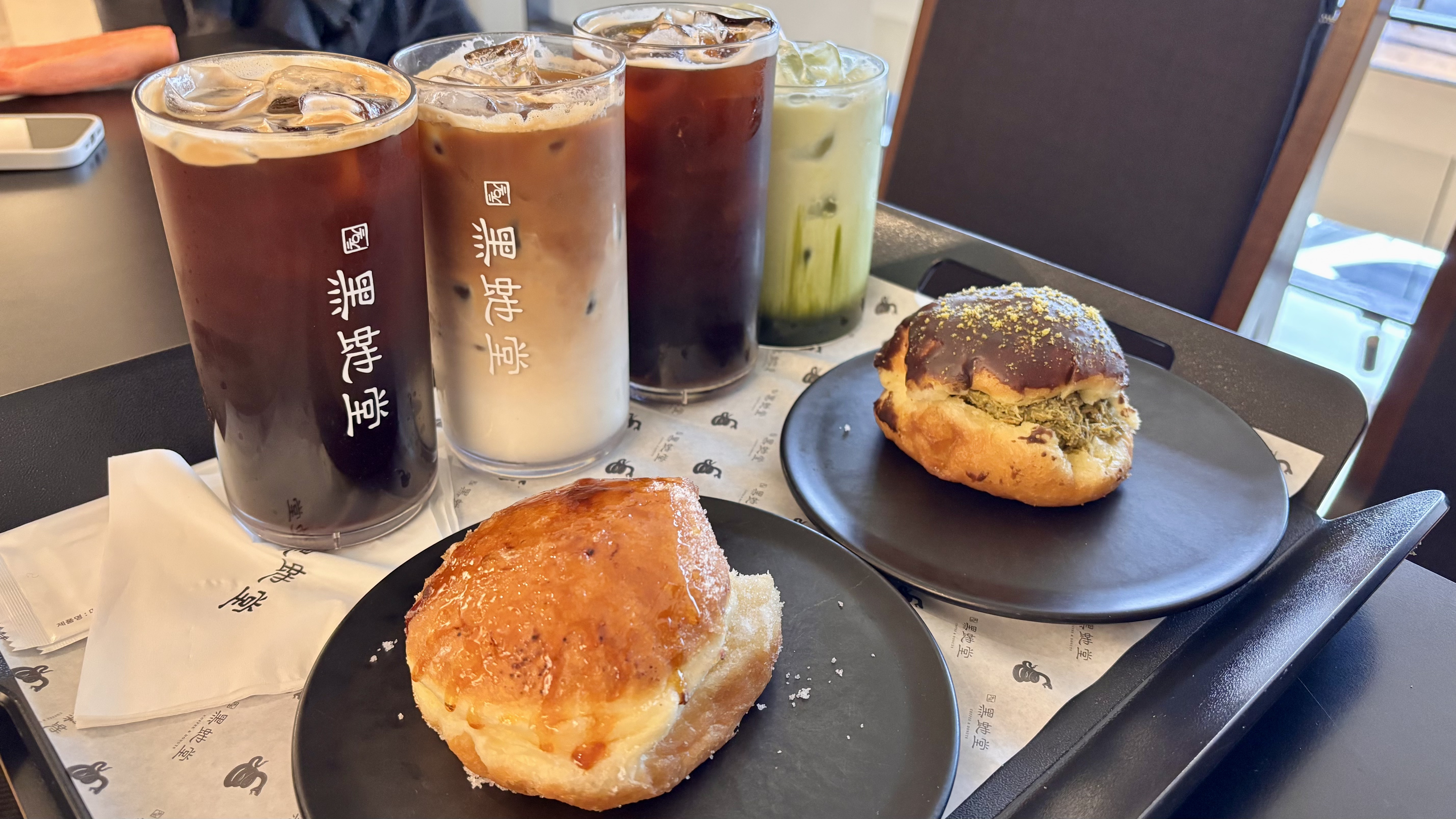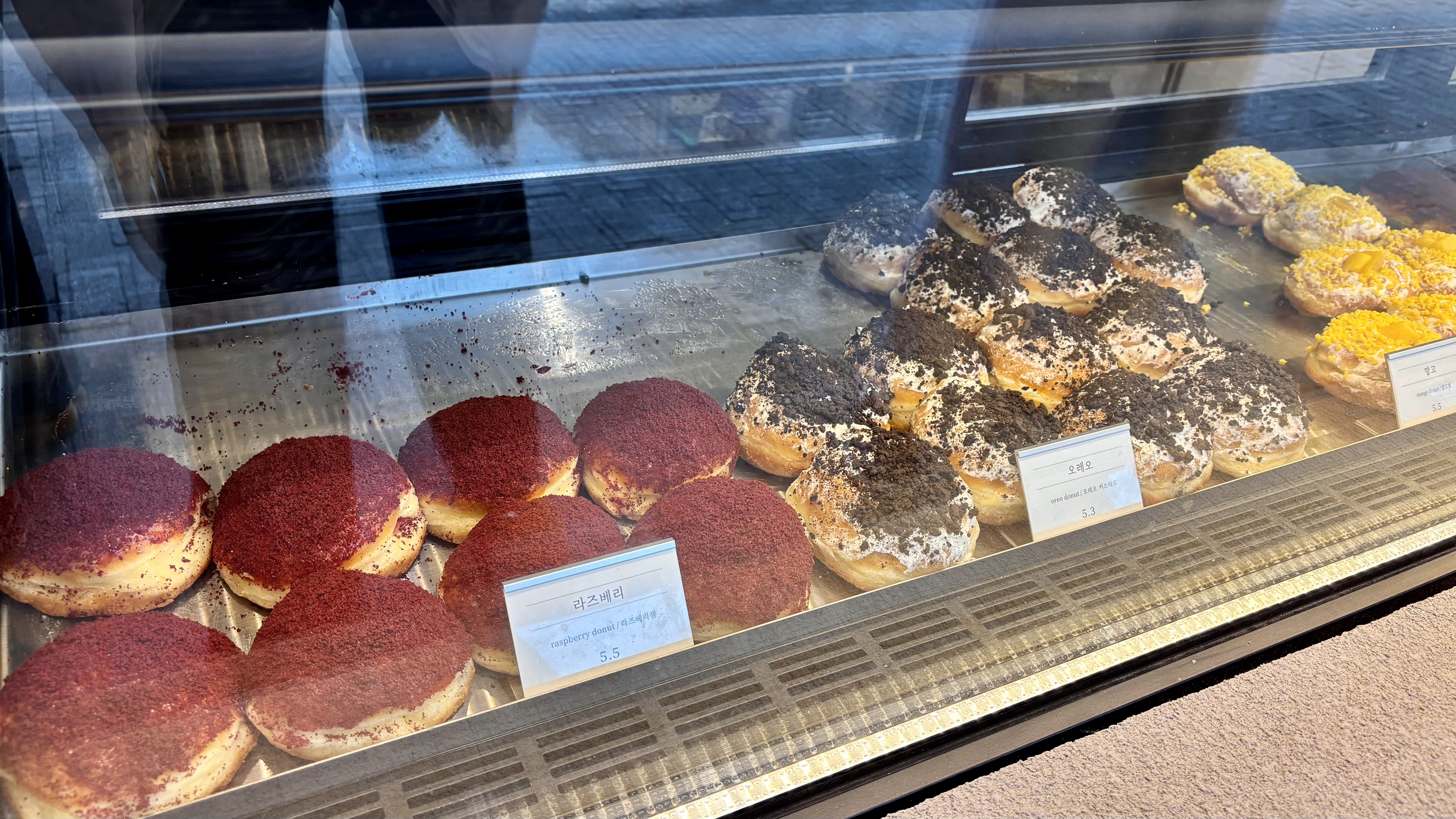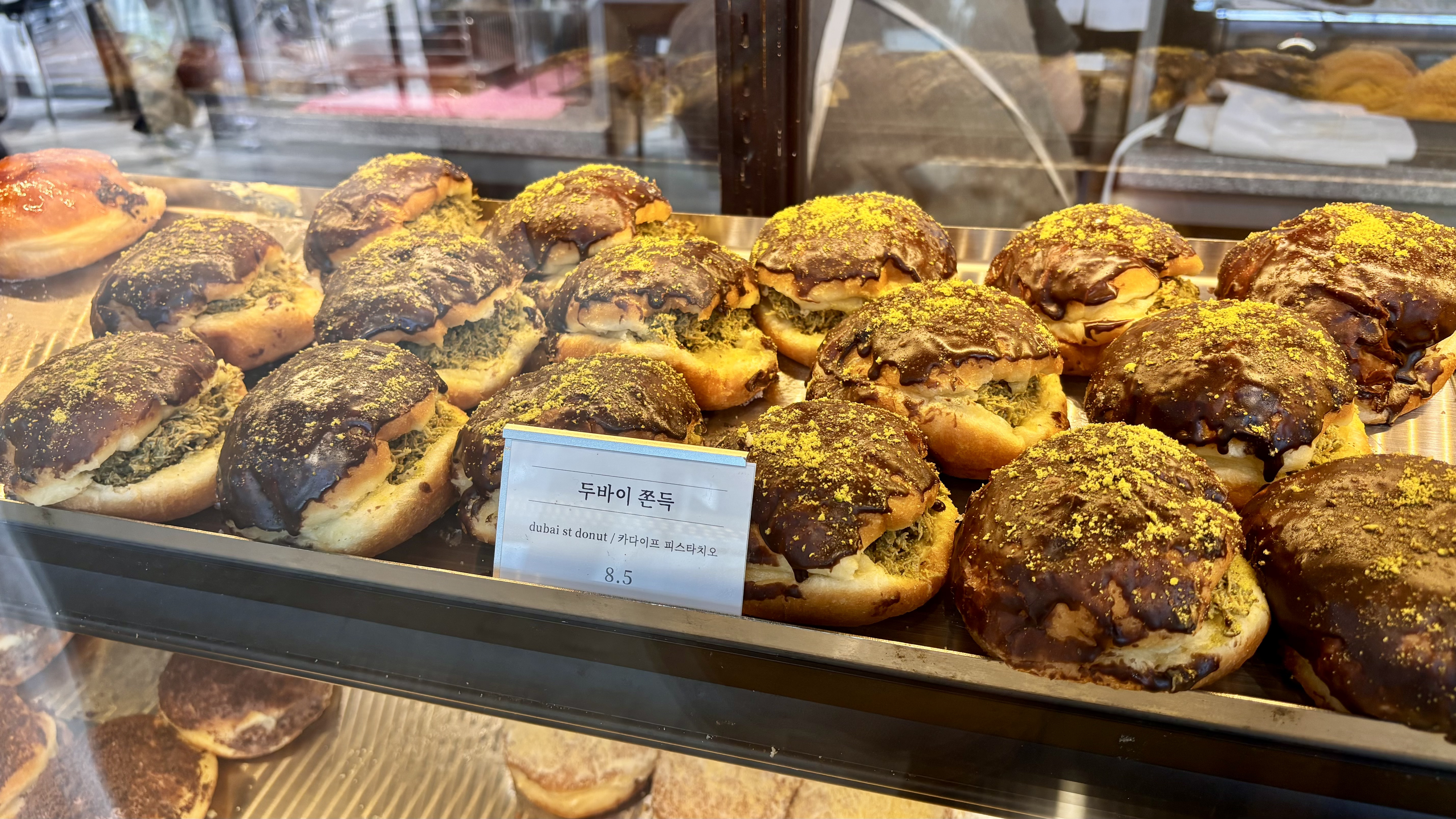 카운터에서 바로 음료와 도넛을 한 번에 주문하면 되는데요. 도넛은 개당 5천 원대의 가격을 형성 중이었습니다. 그 와중에 유행의 끝물이었던 두바이 쫀득은 8천 원대. 가장 기본이 되는 크림브륄레와 함께 두바이 쫀득은 이때까지 경험이 없었기에 주문해 봤습니다.