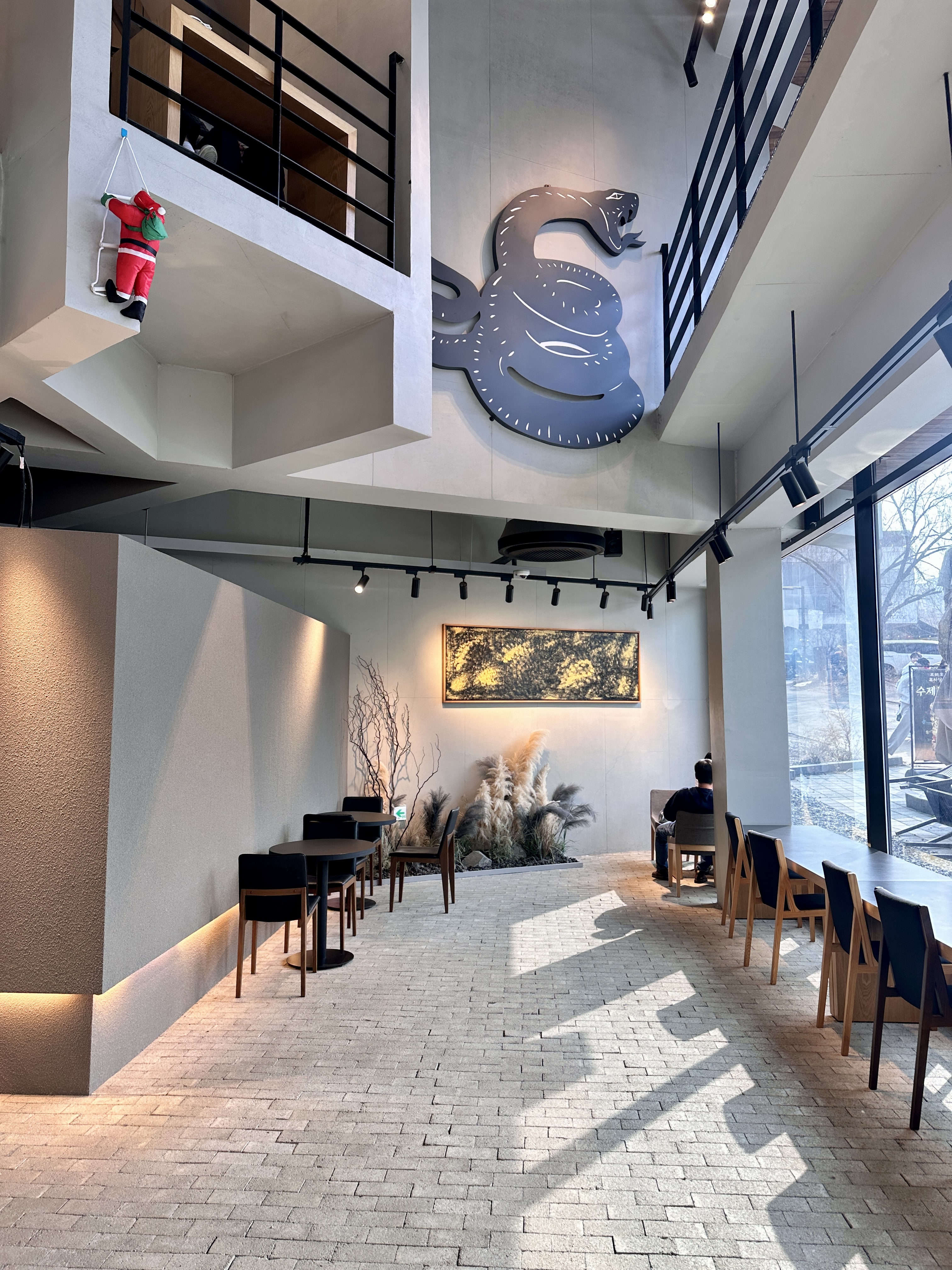 들어온 내부입니다. 정렬되지 않은 이 방향 저 방향 섞인 사선들이 매장을 더 넓어 보이게 했던 것 같습니다. 내부 벽면에도 검은 뱀이 큼직하게 붙어 있네요. 아 설마, 똬리를 튼 모습이 도너츠 같아서? 그래도 여전히 서로가 영 착착 붙진 않는단 생각입니다.