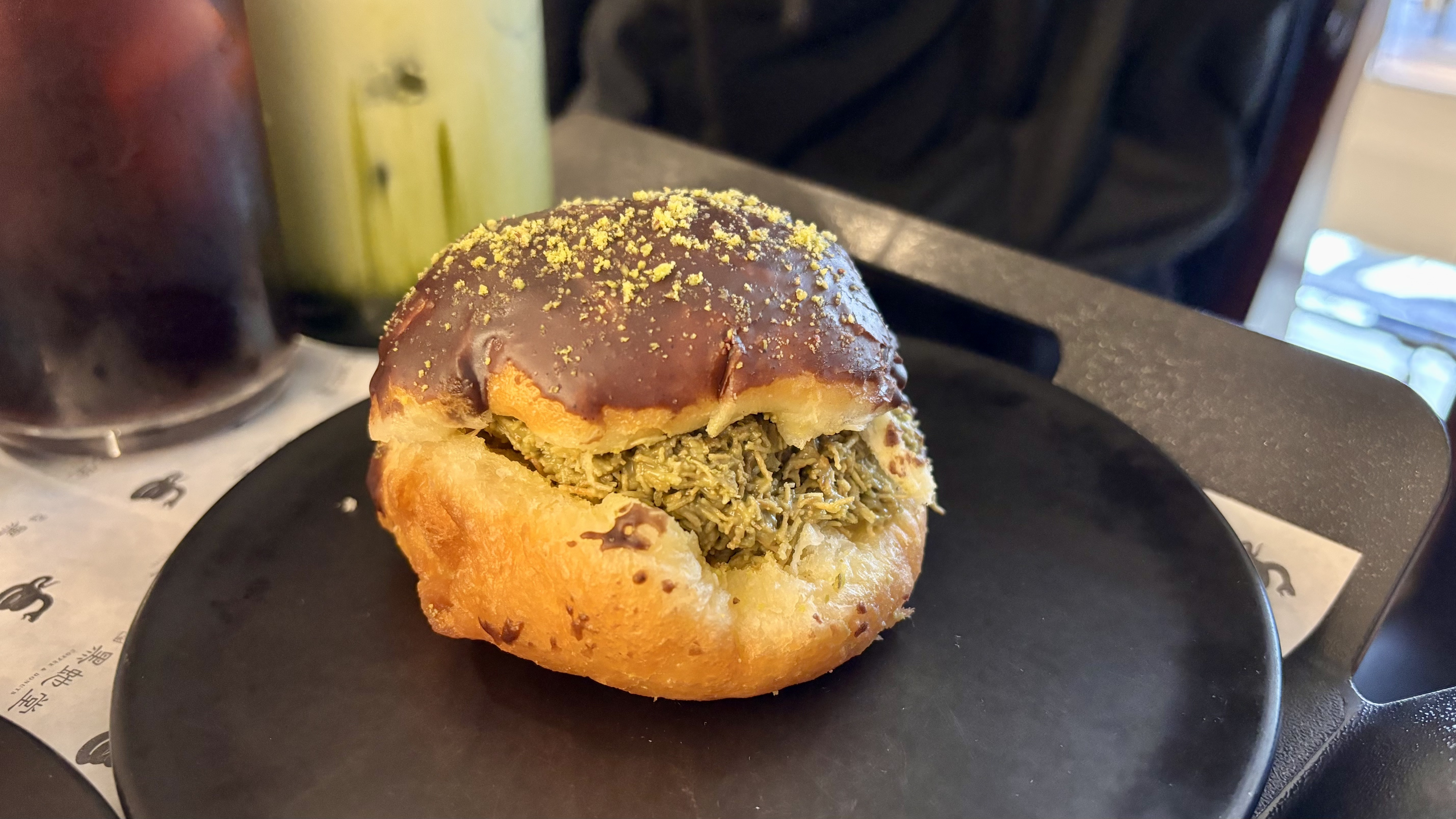 장인어른이 신기하게 드시던 두바이 쫀득 도넛입니다. 두쫀쿠가 유행하더니 도너츠 버전으로도 판매를 하게 된 겁니다. 얼핏 보면 여물을 가득 채워 넣은 것도 같았는데, 이것도 두 남자의 첫 경험이었습니다.