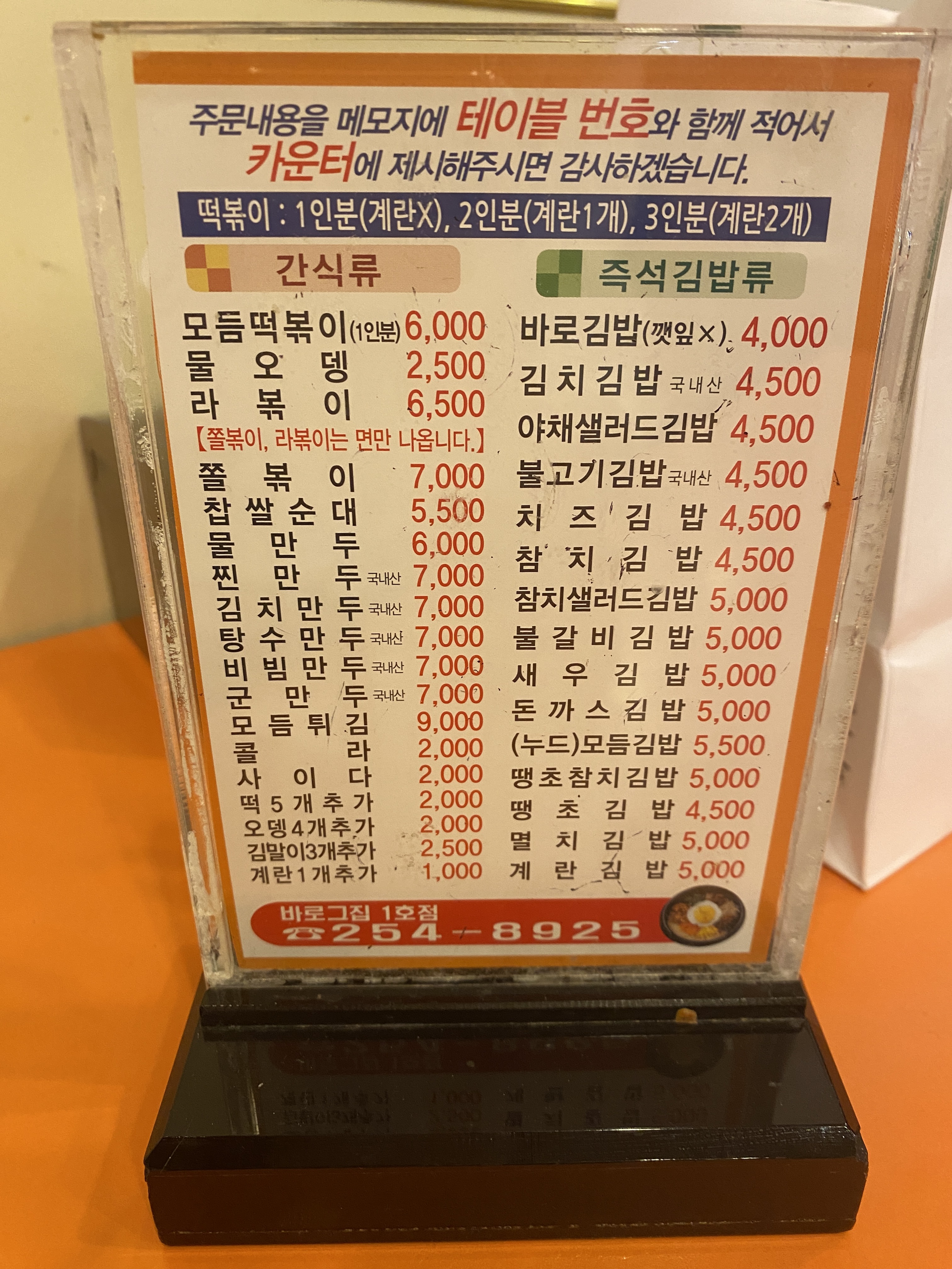 본점의 메뉴판은 학창시절 방문하던 곳과 크게 다르지 않네요. 다만 지나온 세월만큼이나 가격은 예전 같지 않습니다. 필자가 가장 좋아라 했던 구성은 떡볶이와 참치샐러드김밥, 또는 쫄볶이와 김밥의 조합.